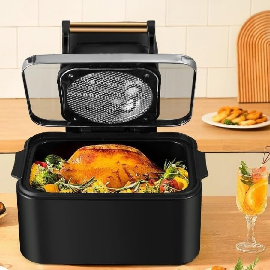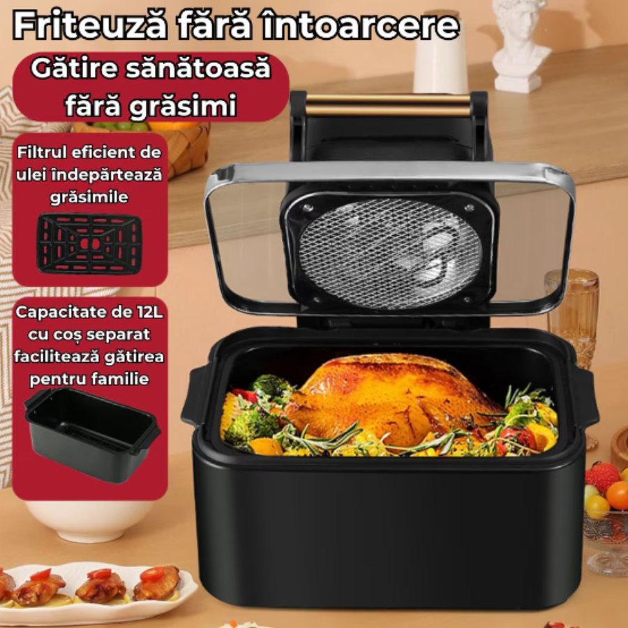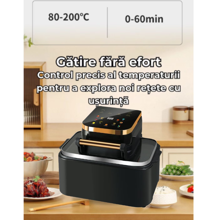 Transforma gatitul intr-o experienta rapida si sanatoasa cu friteuza profesionala cu aer cald, 3 in 1. Cu o capacitate impresionanta de 12 litri, functii inteligente si 11 programe presetate, este ideala pentru preparate delicioase fara ulei – de la cartofi prajiti crocanti pana la pui intreg sau deserturi aromate.