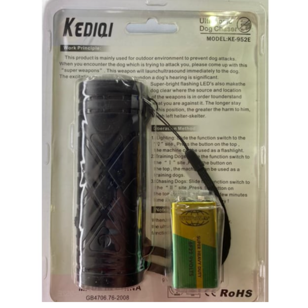 Utilizare: Apăsați butonul de activare atunci când vă apropiați de un câine necunoscut pentru a emite sunetele ultrasonice care îl vor ține la distanță.