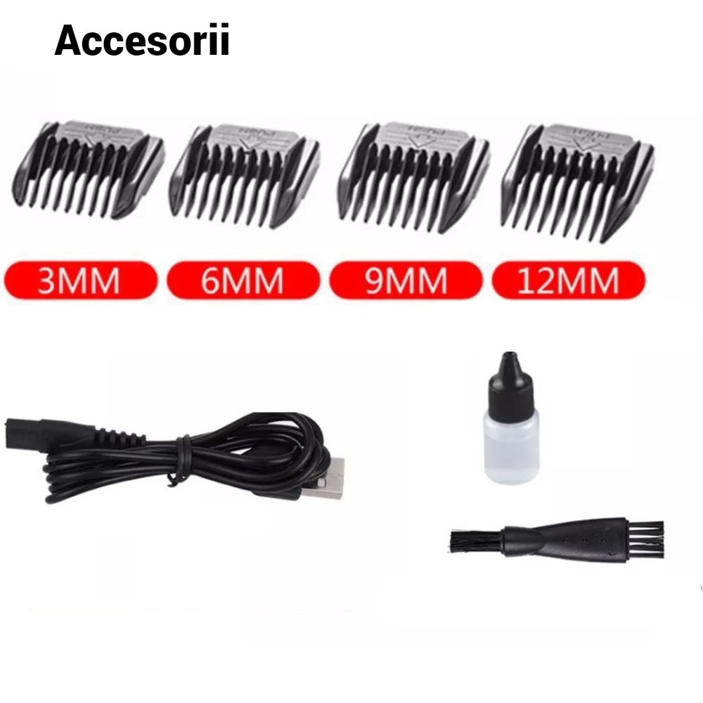 Pachetul contine: Perie curatare Sticluta cu solutie pentru intretinere Manual tehnic 4 capete atasabile cu 4 dimensiuni - 3-6-9-12 mm Acumulator cu autonomie mare - timp de functionare aprox. 45 min Alimentator la 220V - 3 V / 300 mA Frecventa - 50 Hz Putere: 3W Dimensiuni: Lungime: 17,5 cm Latime lama: 4,5 cm Nota! Se recomanda spalarea si tunderea cainelui cu foarfeca, inainte de folosirea aparatului profesional!