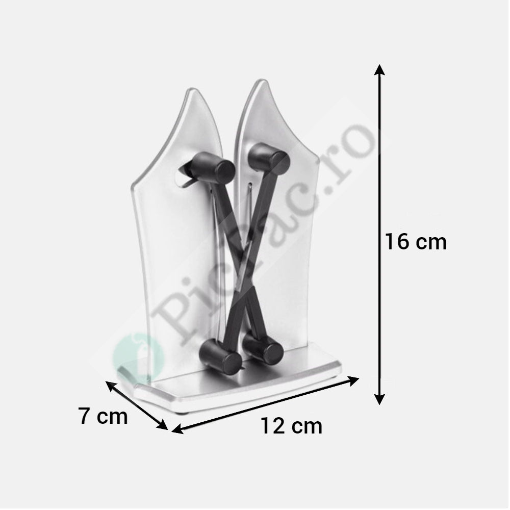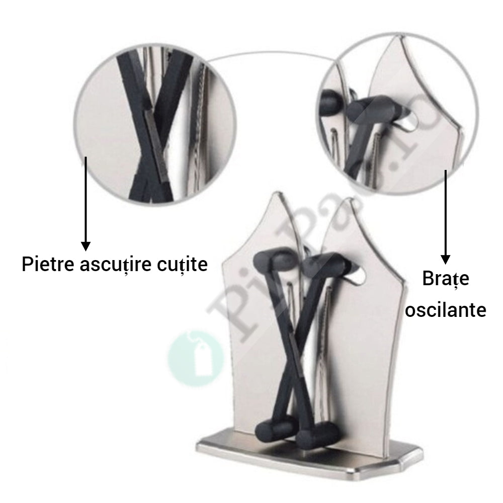 Cu acest aparat ascutirea se realizeaza prin tragerea lamei cutitului printre 2 lamele din otel inoxidabil, de la baza lamei spre varf, de sus in jos. Are doua brate independente cu arc, care contureaza marginea cutitului mai bine decat o piatra de ascutit cutite.