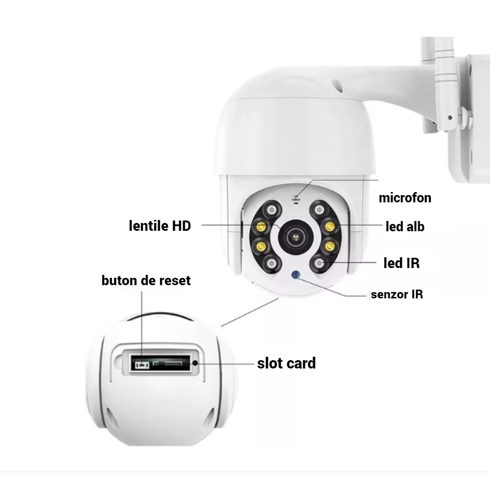 Camera are o durabilitate crescută, deoarece obiectivul camerei se află în interiorul domului. Are protecție impermeabilă, astfel încât să poată funcționa în aer liber fără a fi afectata de vreme. De asemenea, poți folosi aplicația de pe smartphone sau Ios pentru a controla camera și a urmări în direct zona de filmare dorită.