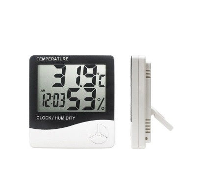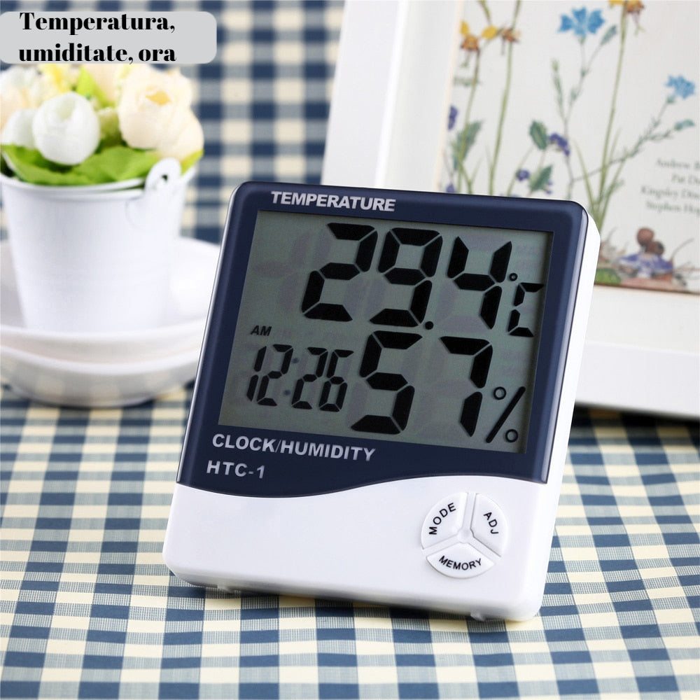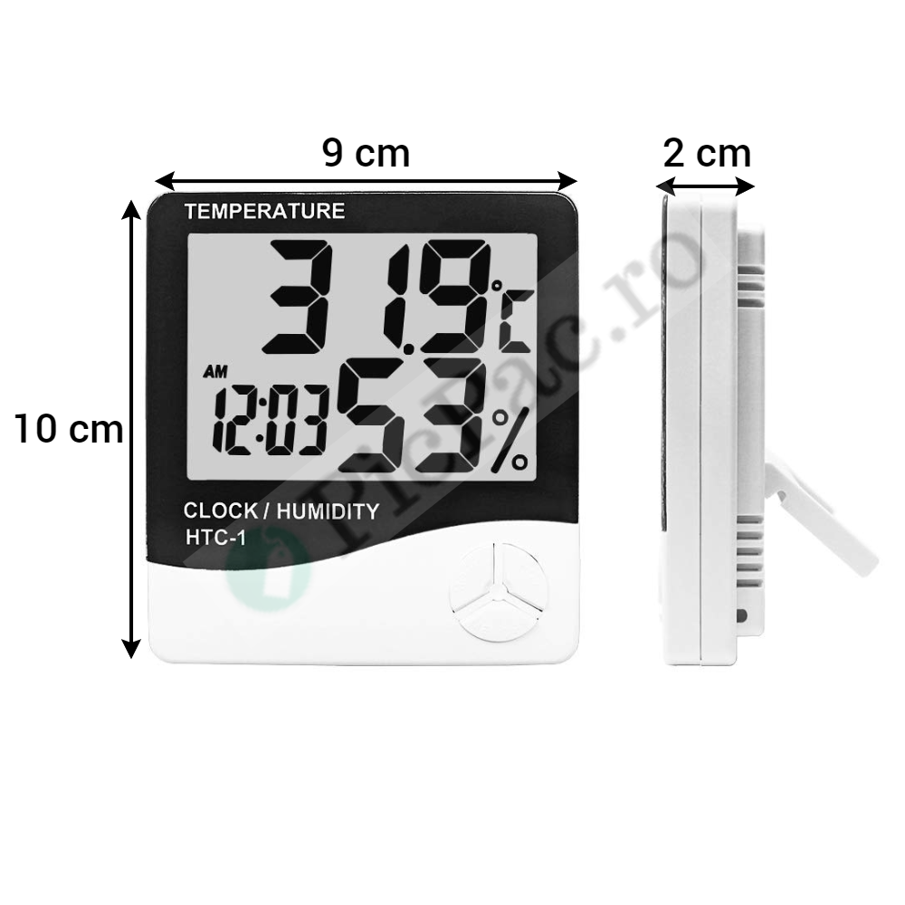 - Este un ceas de birou electronic cu senzor de temperatura si umiditate, afisaj LCD, aspect modern, profesional.