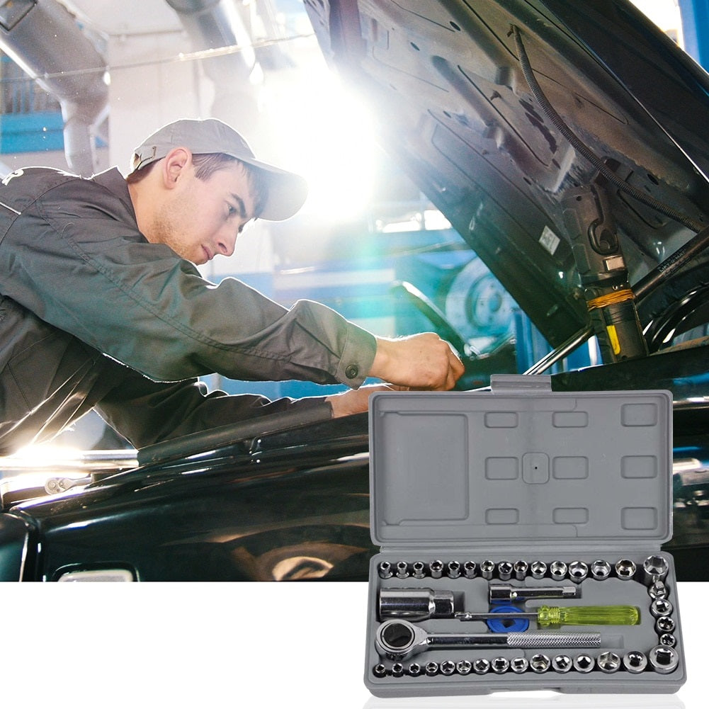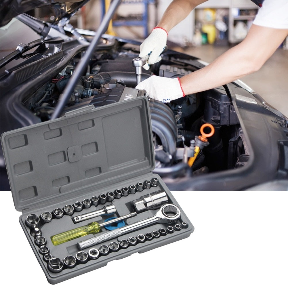 Chei tubulare, cu clichet, trusa 40 de piese, maner, prelungitor, adaptor, spinner handle, metric socket si cutie de transport si de depozitare.
