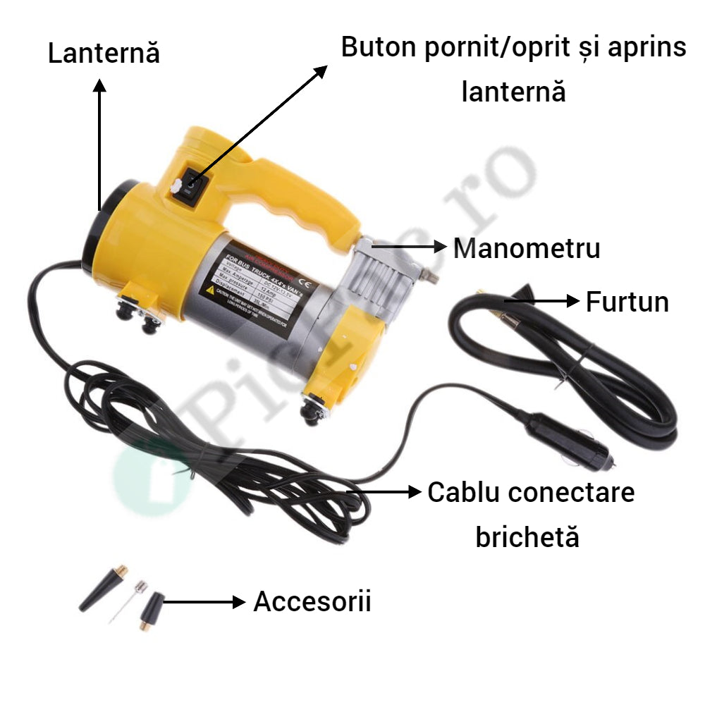- Este special conceput pentru a asigura umflarea rotilor autovehiculelor mari cum ar fi microbuze, auto 4x4, camionete, cu alimentare la bricheta auto.