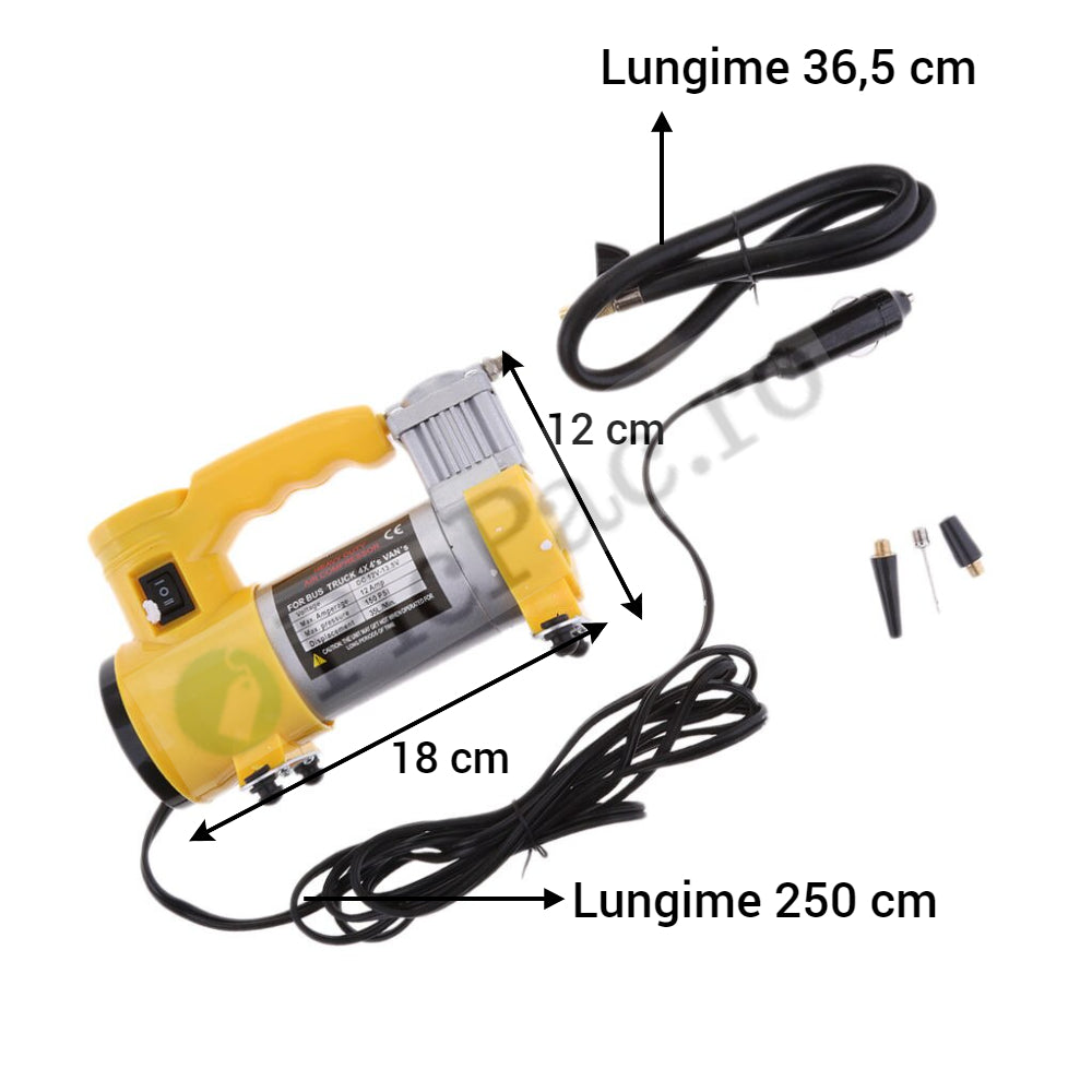 Cablu alimentare 2,5 m Lungime furtun: 36,5 cm Carcasa metalica Tensiune de operare: 12 V Presiune de operare: 7 bar (maxim) Dimensiuni: Lungime: 18 cm Latime: 12 cm Diametru: 7 cm Greutate: 1,9 kg Max amperaj: 14amp Presiune max: 150 PSI Capacitatea mare de pompare: 35 litri/min Manometru incorporat pentru vizualizarea presiunii pneurilor Poate fi folosit si pentru anvelope mari
