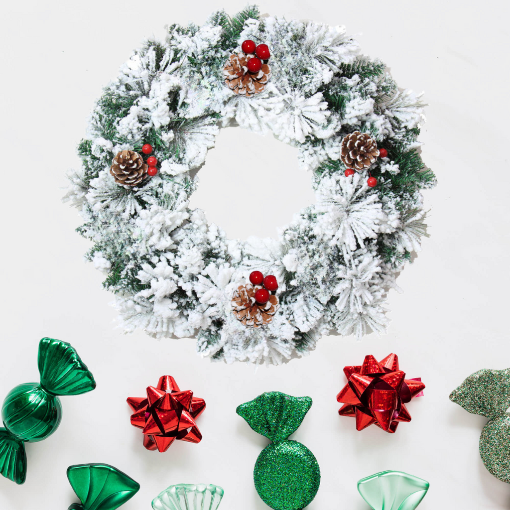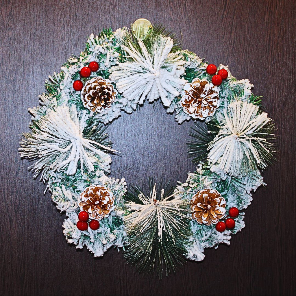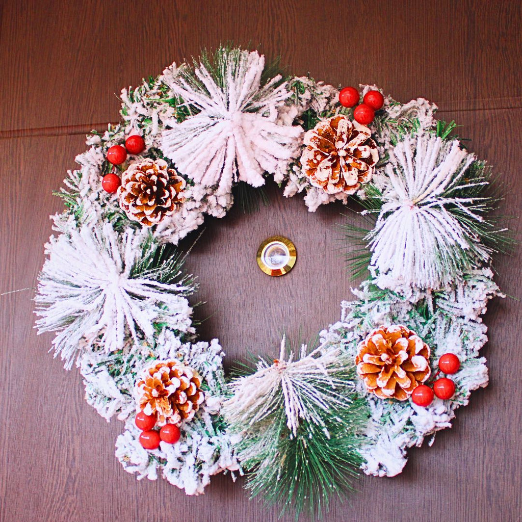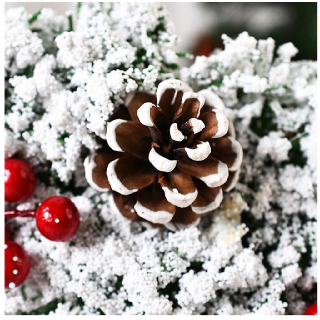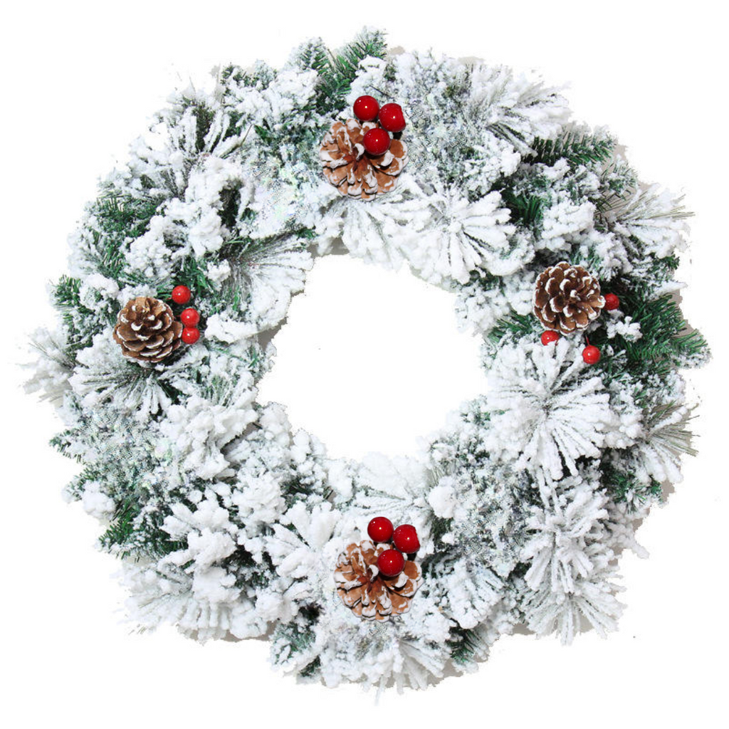 Coronita pentru Craciun, diametru 32 cm, din brad artificial, decorata cu conuri si merisoare, inzapezit Verde/Alb