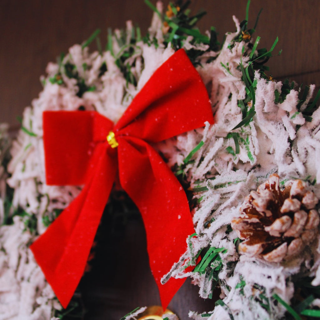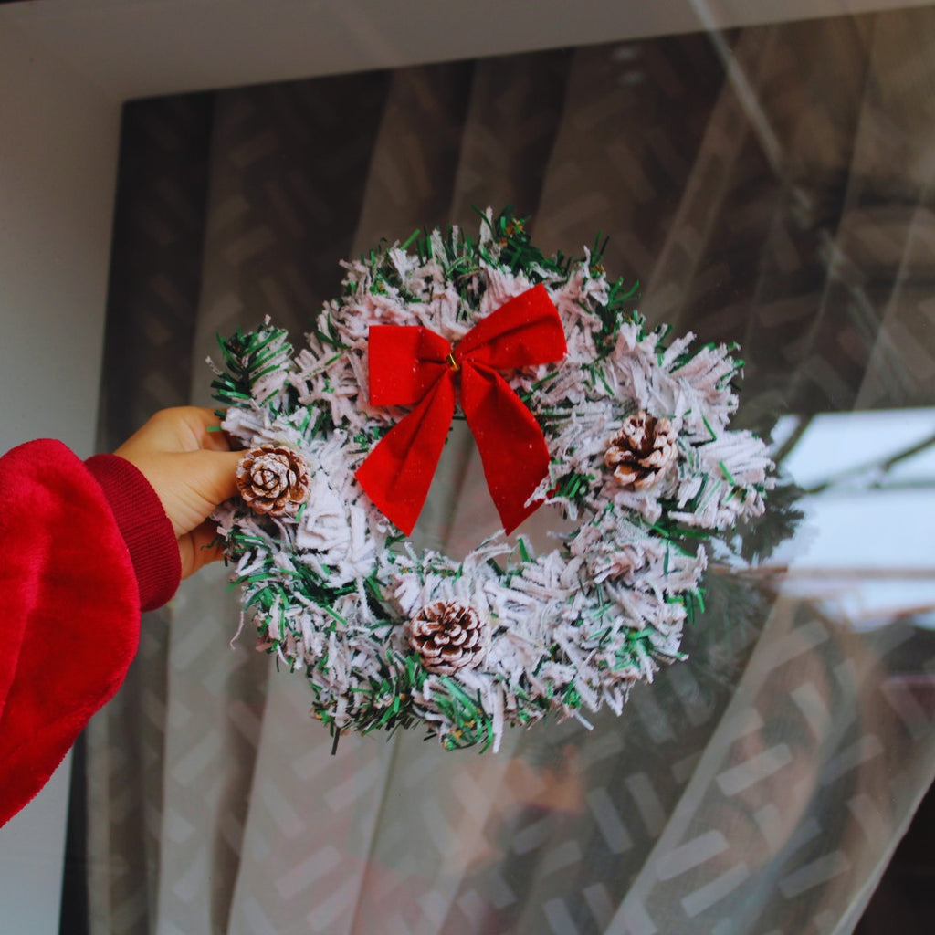 Coronița este decorată cu conuri de brad si fundita, tipice pentru sezonul Crăciunului.