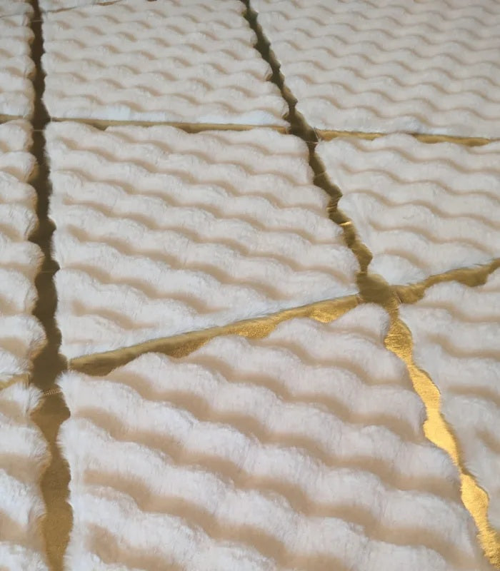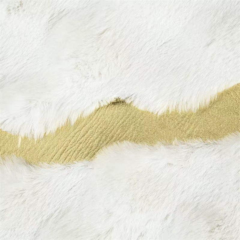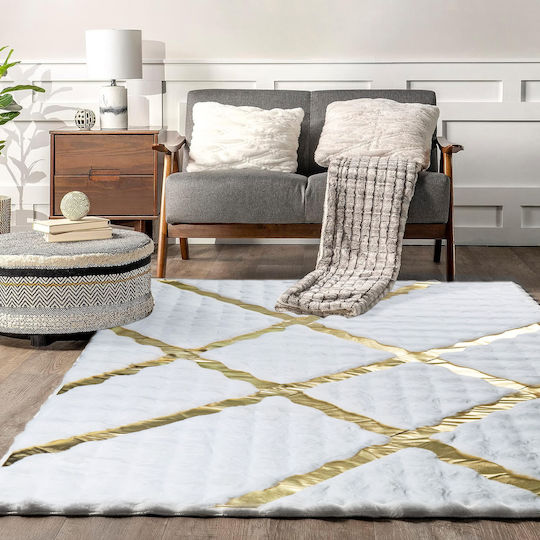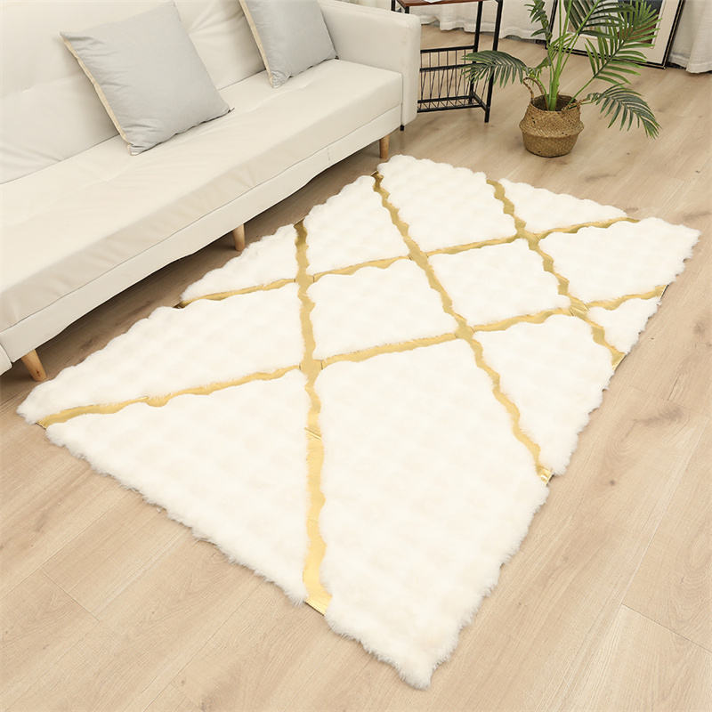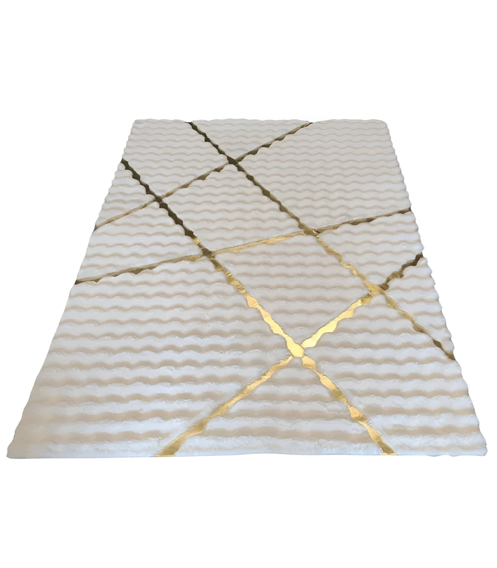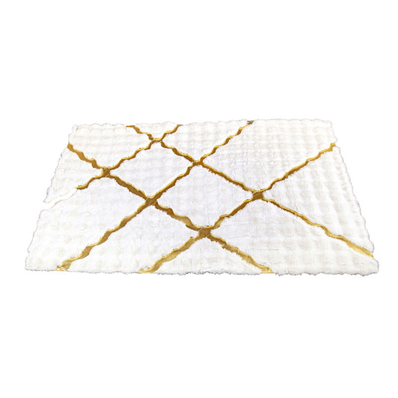 Covor Premium din Blană Artificială Design 3D Bubble, Moale și Pufos, Alb cu Dungi Aurii 120 cm x 180 cm