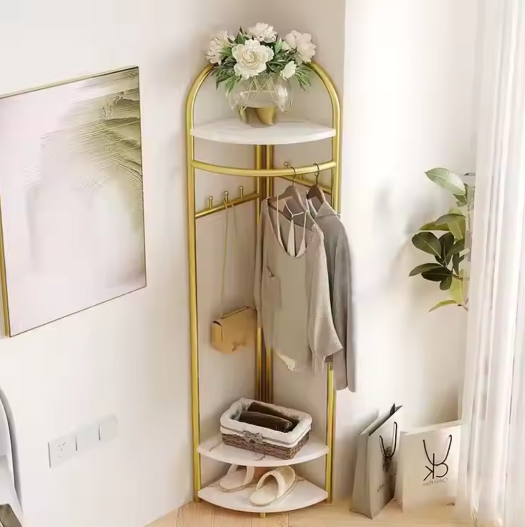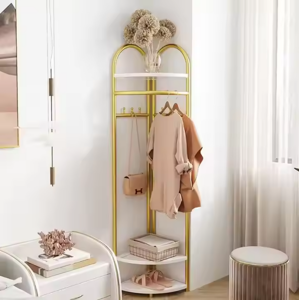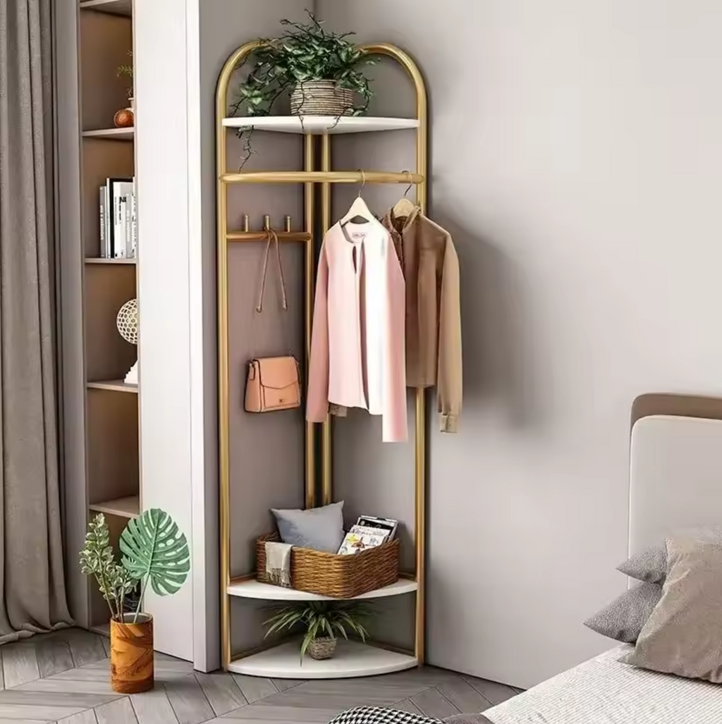 Optimizază-ți spațiul cu acest cuier de colț elegant și funcțional, ideal pentru a organiza hainele, gențile și încălțămintea într-un mod eficient și stilat.