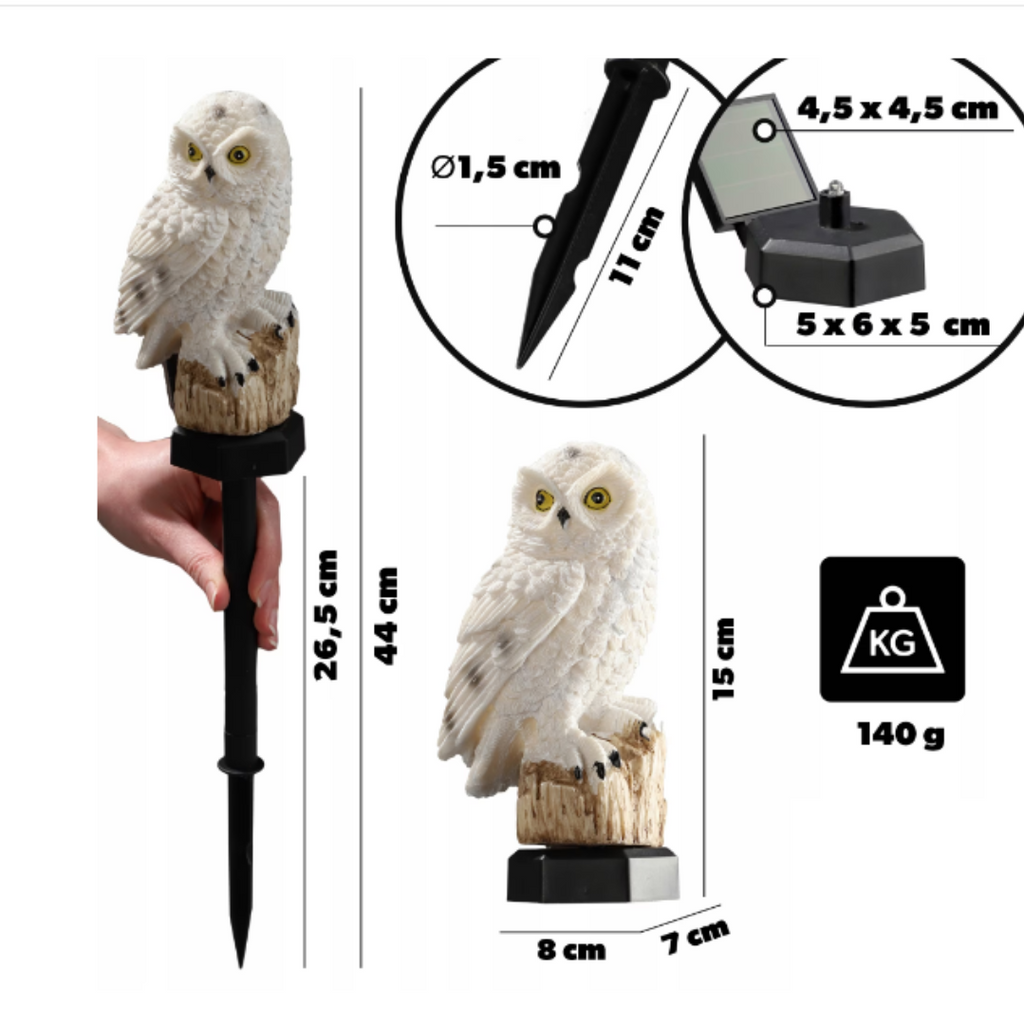 DIMENSIUNI – o reproducere fidela a unei figurine de bufnita alba cu lampa solara ii subliniaza dimensiunile. Inaltime 15 cm, latime aproximativ 8 cm . Lungimea stiftului infipt in pamant este de 26,5 cm, ceea ce va va permite sa montati lampa in siguranta.