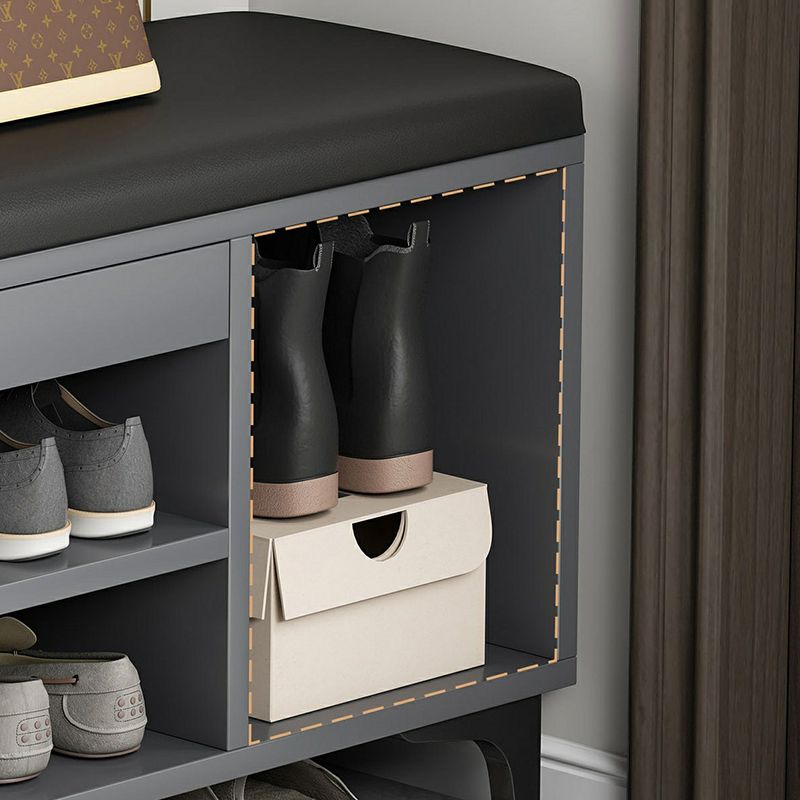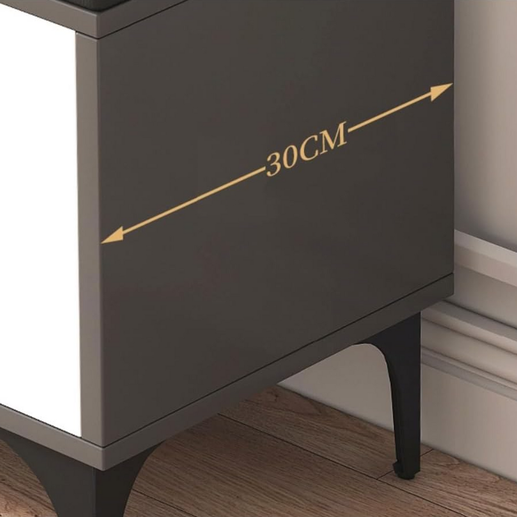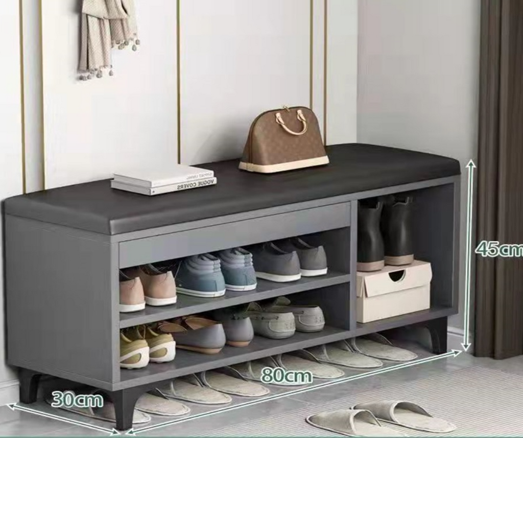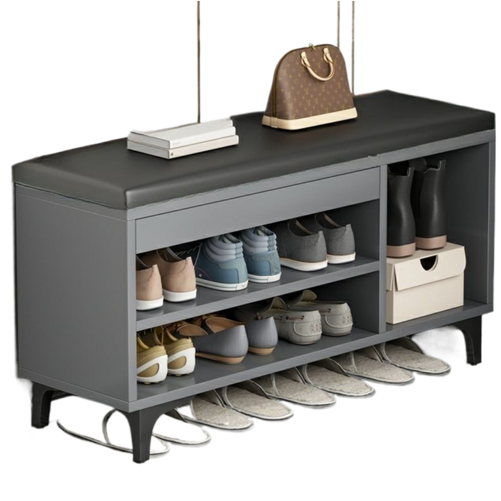 Un dulap modern de depozitare a pantofilor în culoarea gri, echipat cu rafturi și o banchetă, reprezintă o piesă de mobilier practică și elegantă pentru organizarea încăperii tale. Acest tip de dulap combină utilitatea depozitării pantofilor cu confortul oferit de bancheta integrată, creând un spațiu funcțional și plăcut în locuința ta.