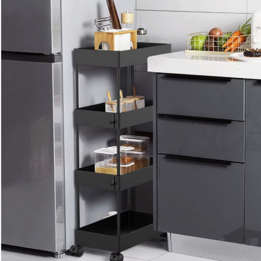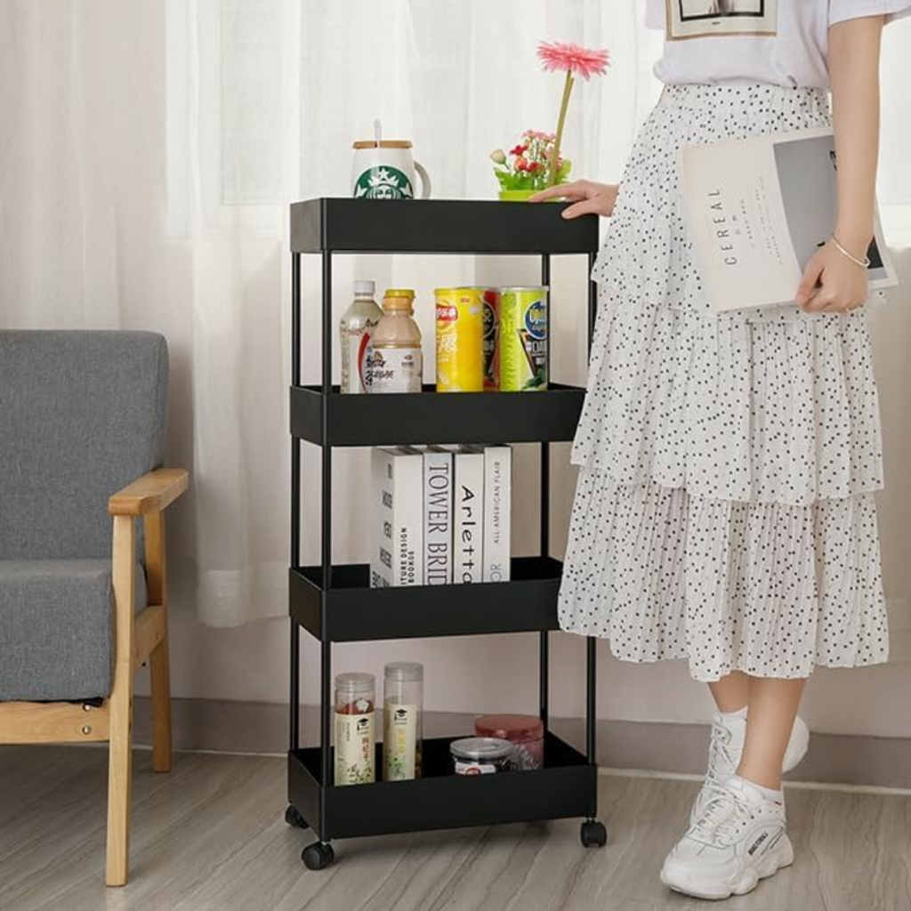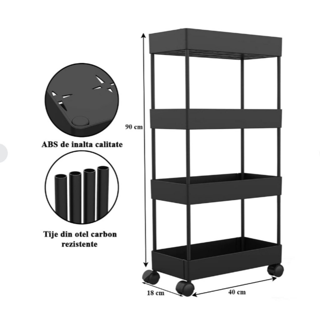 Cu etajera mobila cu roti, 4 rafturi de depozitare, utila pentru spatii inguste, va veti simti in casa dumneavoastra asa cum va doriti - fara dezordine, lucruri imprastiate peste tot sau lipsa de spatiu. Aceasta etajera ajuta la buna functionare a oricarei gospodarii.