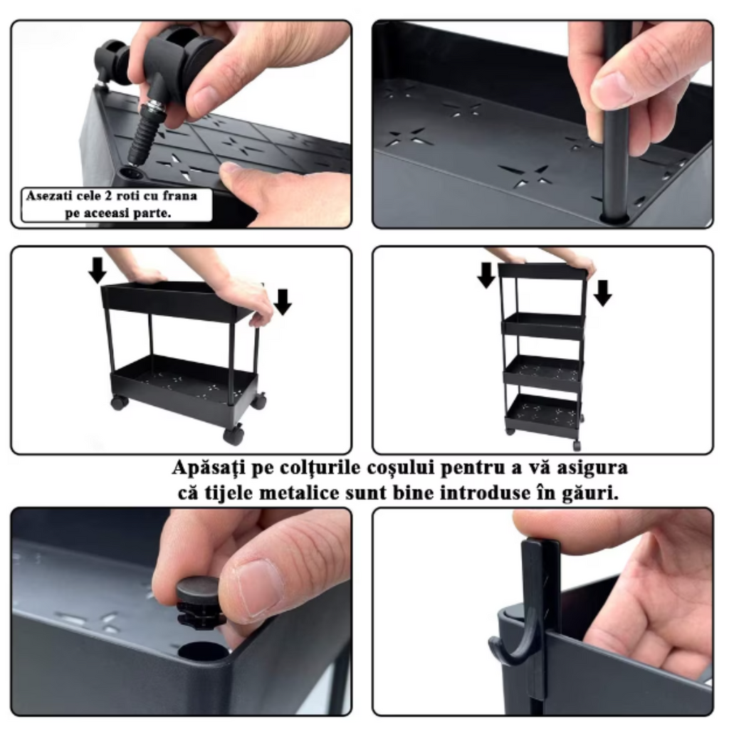 Confectionata din plastic si metal, dispune de roti si 4 polite.