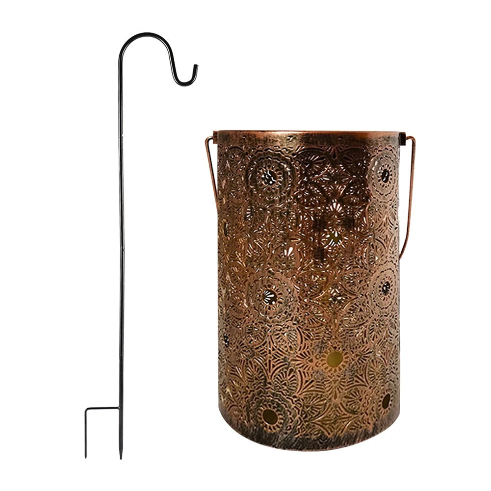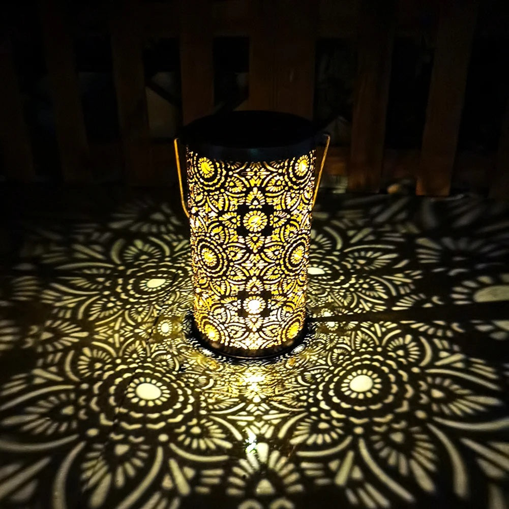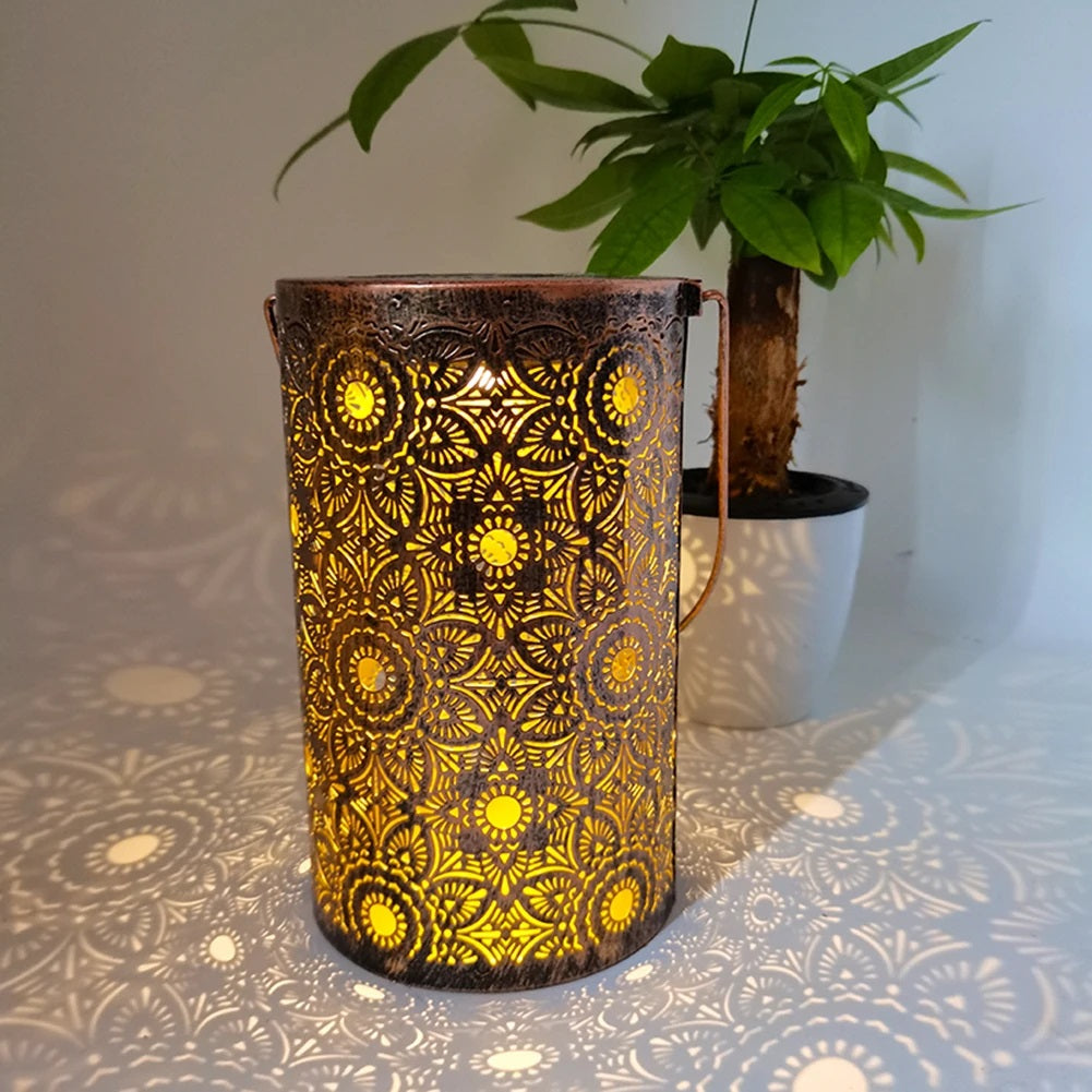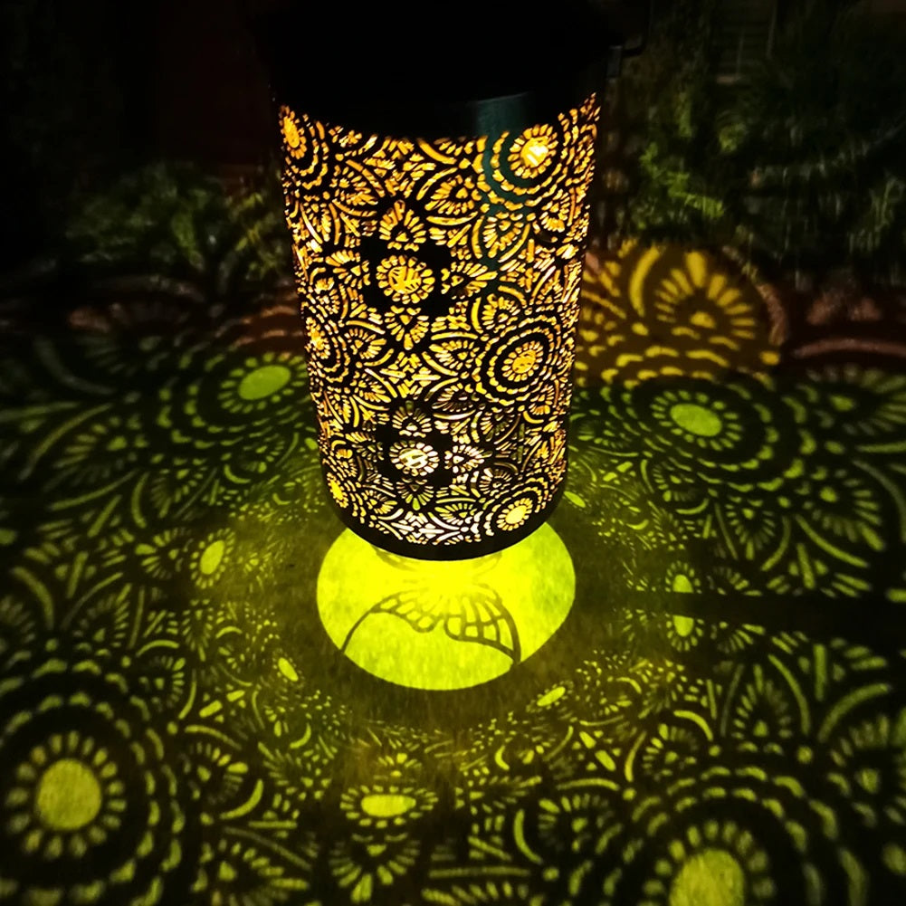 Realizată cu un design retro gol, această lanternă solară suspendată vă va decora spațiul cu modele rafinate și va arunca strălucire romantică caldă și umbre șic după amurg.