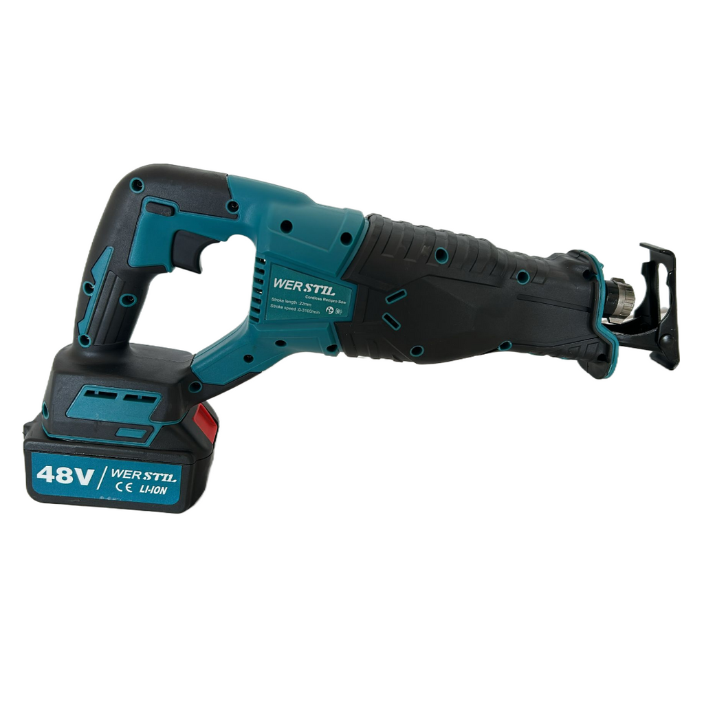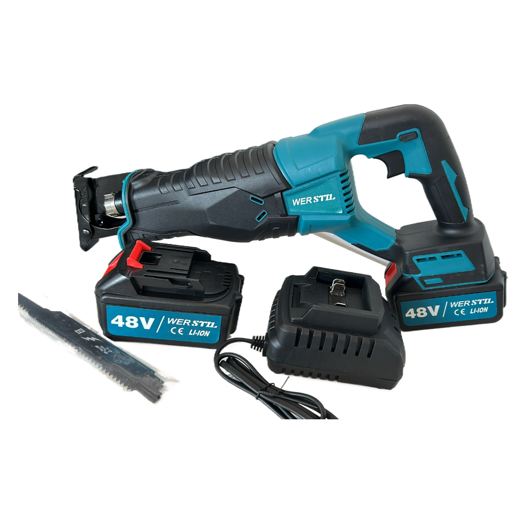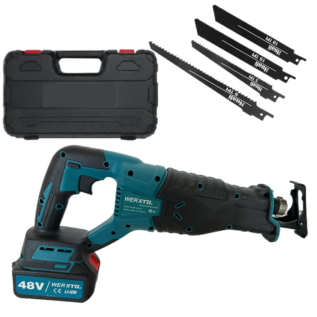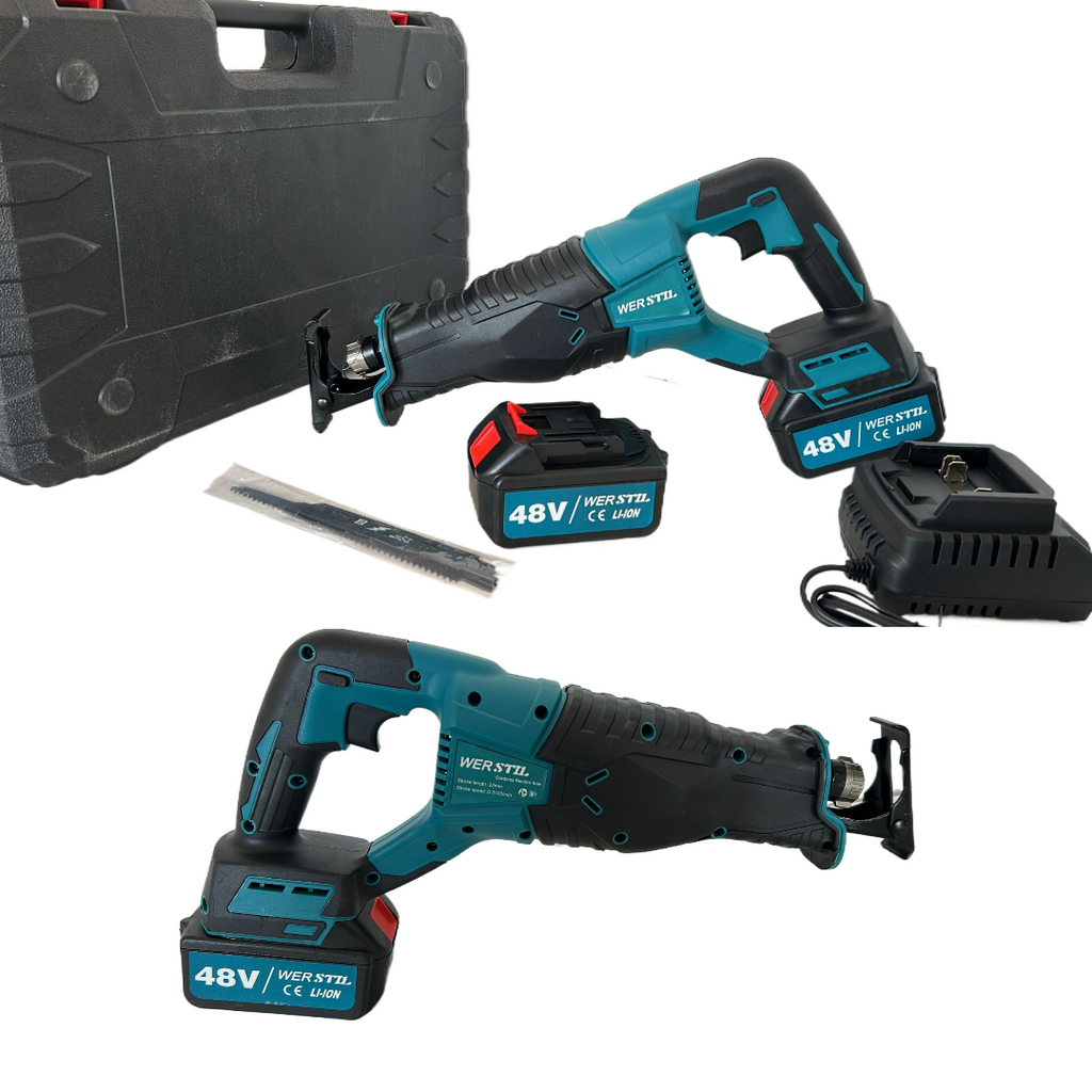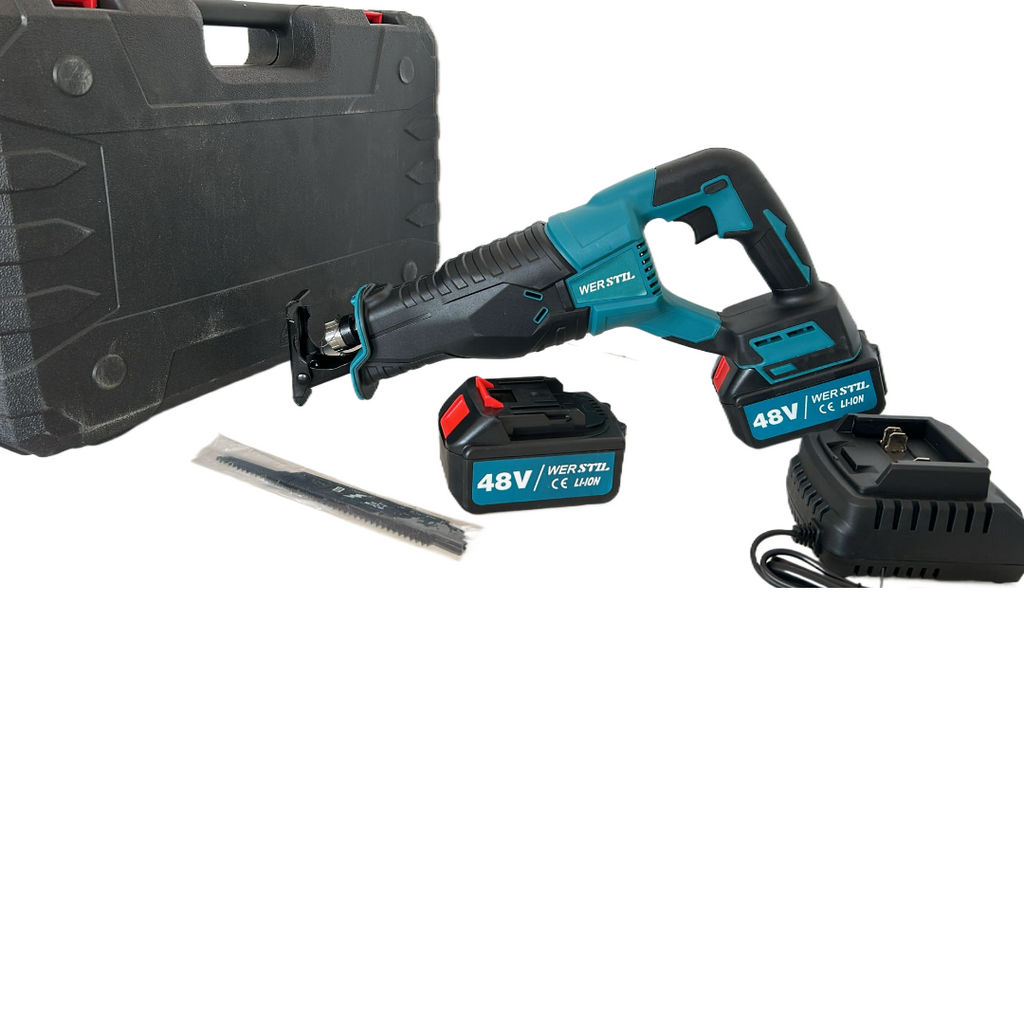 Fierăstrău Alternativ Tip Sabie WERSTIL, 48V, cu 2 Acumulatori, 4 Lame și Încărcător – Performanță și Versatilitate în Tăiere