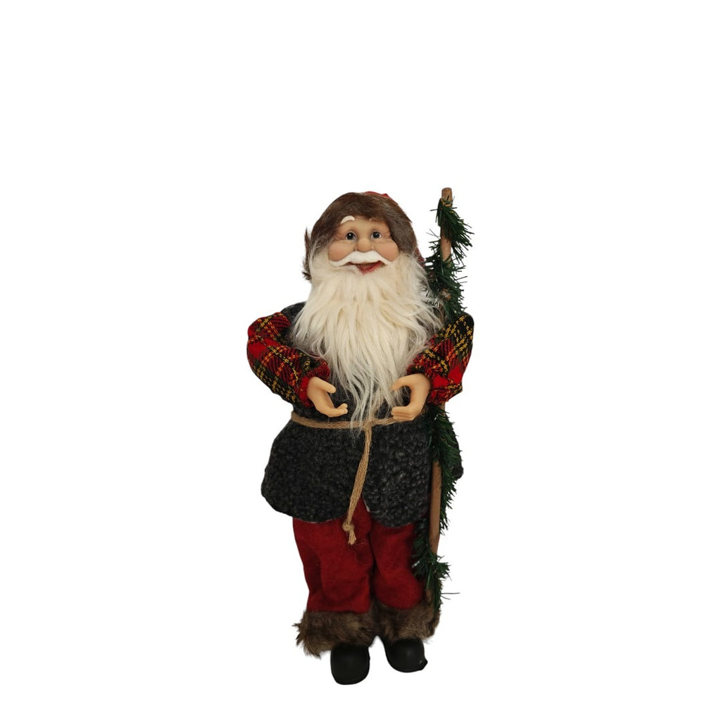 Această figurină decorativă de Moș Crăciun este un accesoriu deosebit pentru decorul de sărbători, aducând o notă tradițională și veselă în casa dumneavoastră. Moș Crăciun este îmbrăcat într-un costum rustic, cu o cămașă în carouri roșii și verzi, vestă din material de lână și pantaloni roșii, toate accesorizate cu detalii de sezon. Figurina este realizată cu atenție la detalii, având o barbă albă stufoasă și o expresie prietenoasă, perfectă pentru a aduce bucurie în perioada Crăciunului.