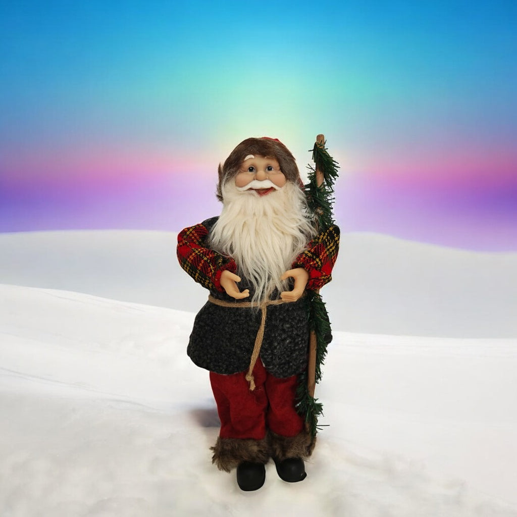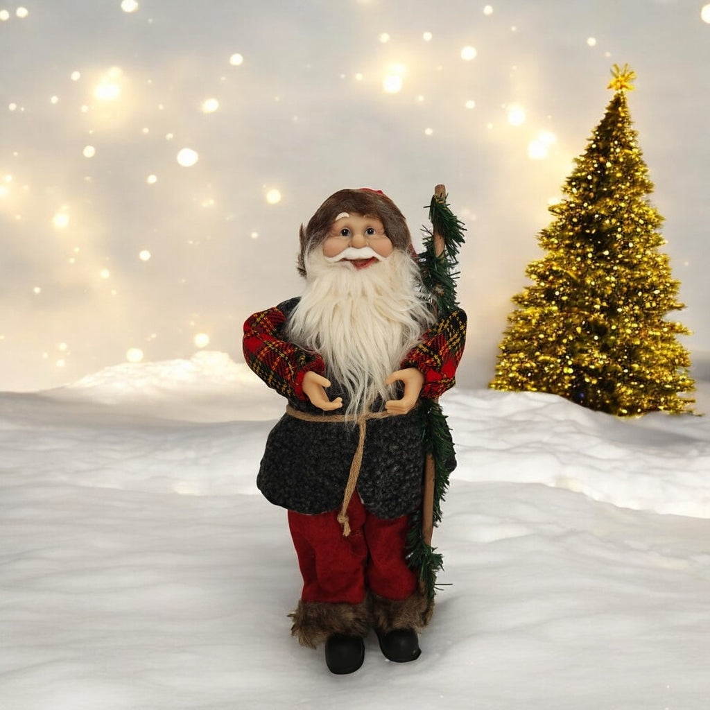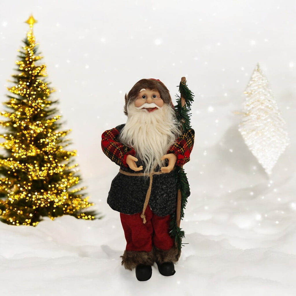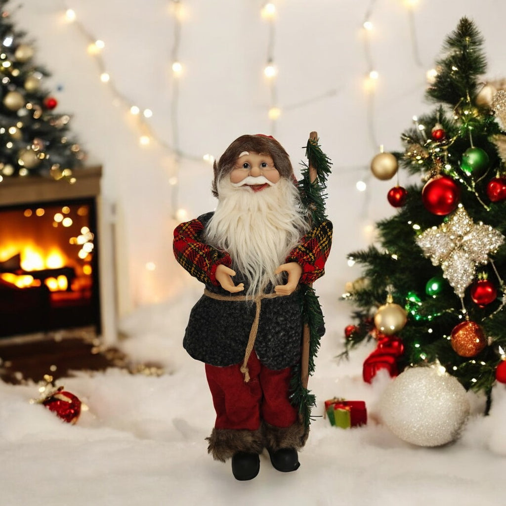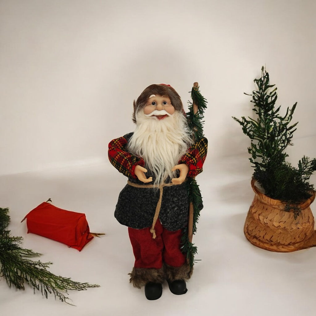 - Accesorii festive: Moș Crăciun are în mână o nuielușă, detaliu care completează aspectul său autentic și adaugă un element de farmec rustic.