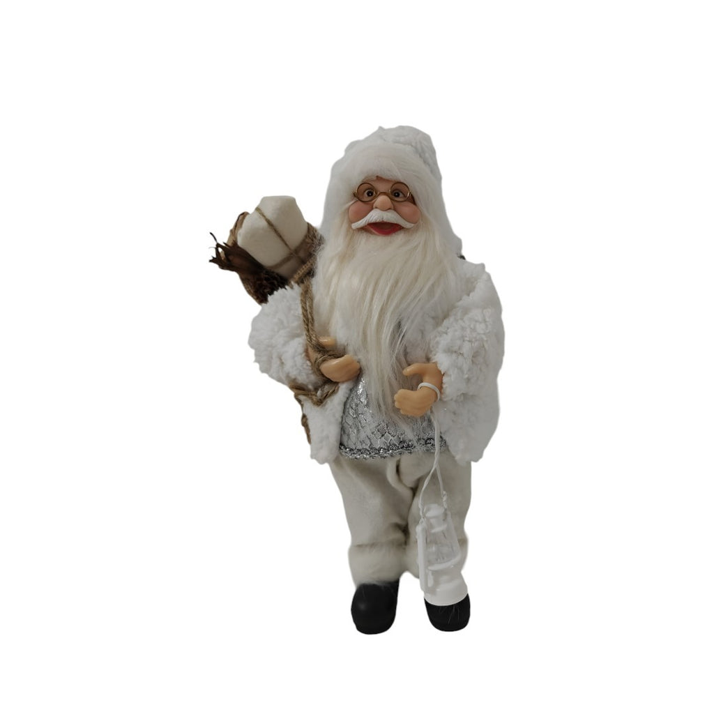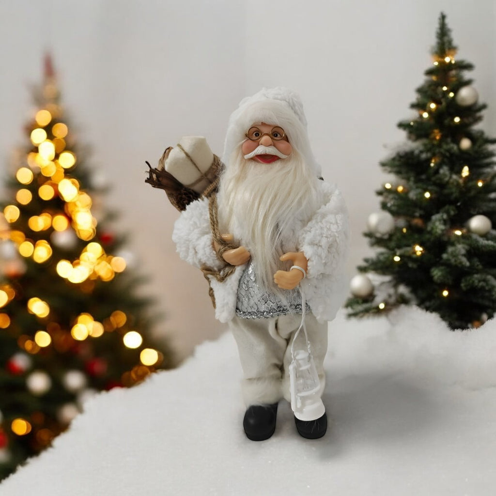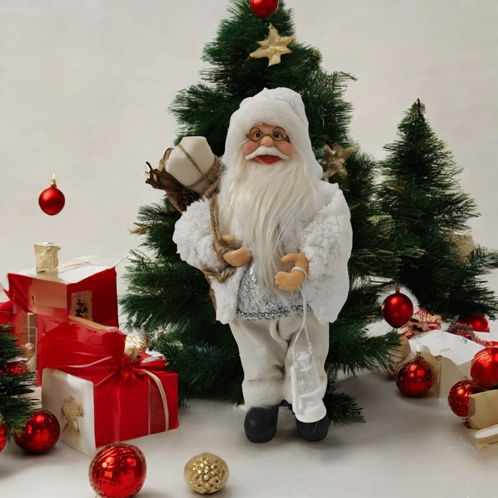 - Moș Crăciun este reprezentat într-un costum alb pur, cu accente argintii strălucitoare. Această alegere cromatică oferă figurinei un aspect elegant, aducând în același timp farmecul zăpezilor de iarnă în decorul de sărbători.