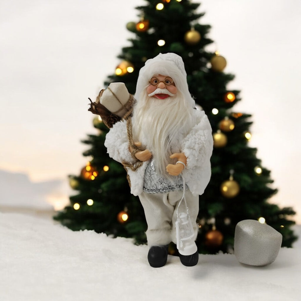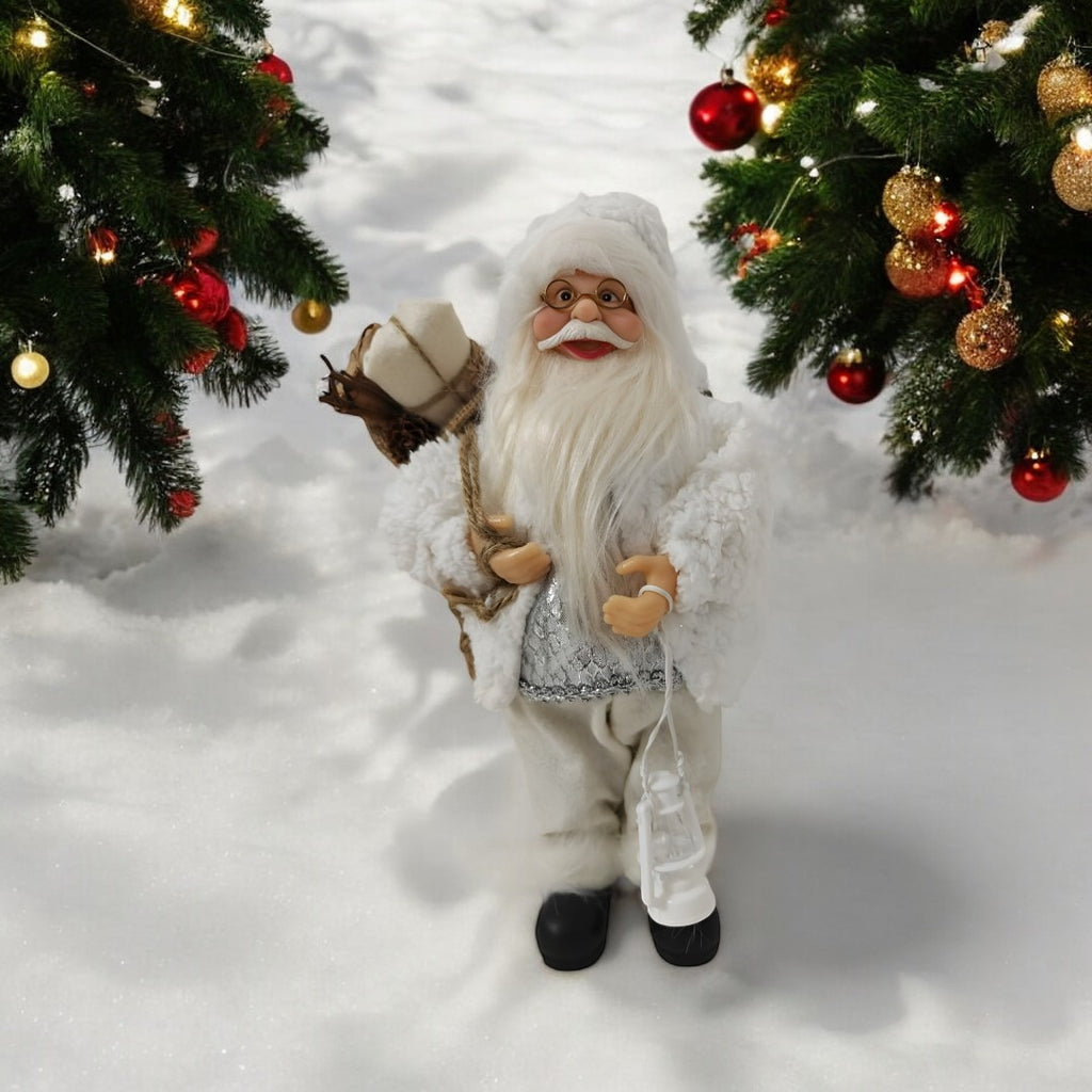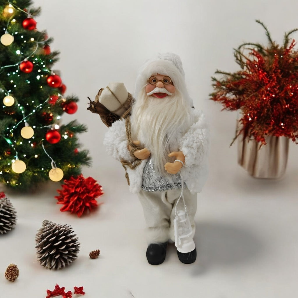 Această figurina Moș Crăciun alb cu finisaje argintii și un felinar elegant este ideală pentru a aduce un strop de magie de iarnă și strălucire în decorul tău de Crăciun. Detaliile sale atent lucrate și felinarul pe care îl poartă în mână adaugă un aer autentic și festiv, fiind perfectă pentru orice decor de sărbători.