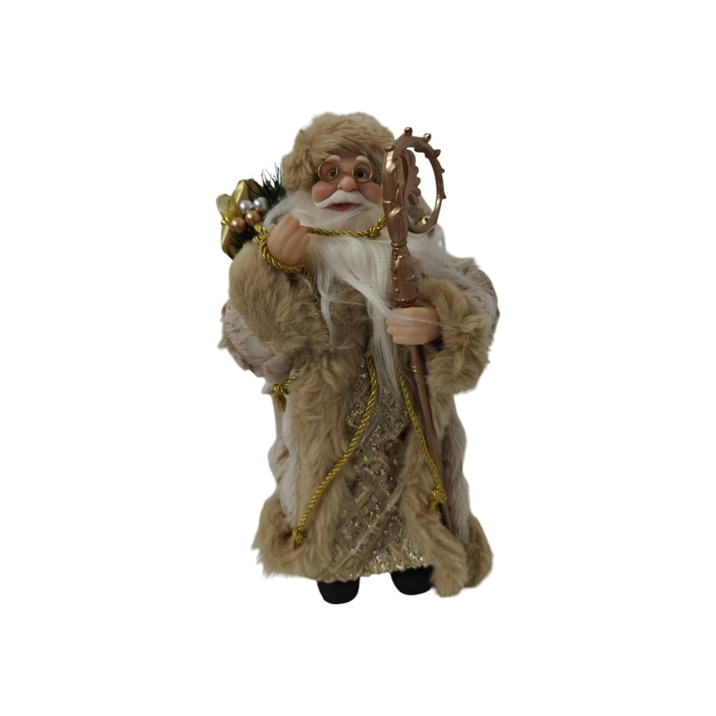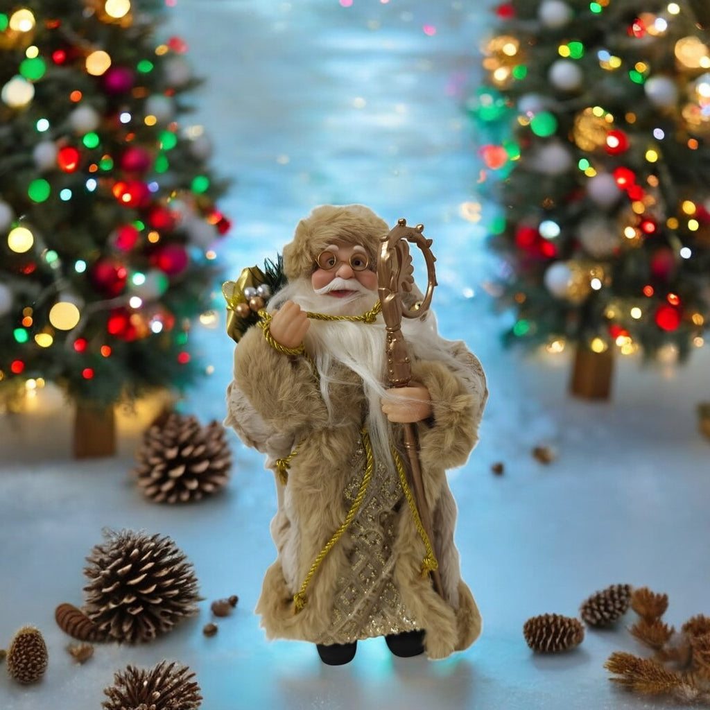 - Moș Crăciun este accesorizat cu un sceptru elegant, simbol al autorității sale magice în perioada sărbătorilor. Sceptrul are detalii aurii care completează armonios întreaga compoziție, aducând un plus de strălucire figurinei.