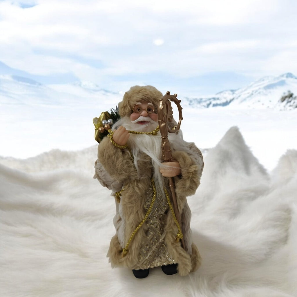 - Figurina îl reprezintă pe Moș Crăciun într-o ipostază maiestuoasă, îmbrăcat într-un costum de lux, în nuanțe aurii și crem. Această alegere cromatică conferă un aer regal și sofisticat, potrivit pentru un decor de Crăciun rafinat.