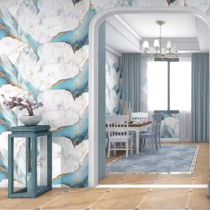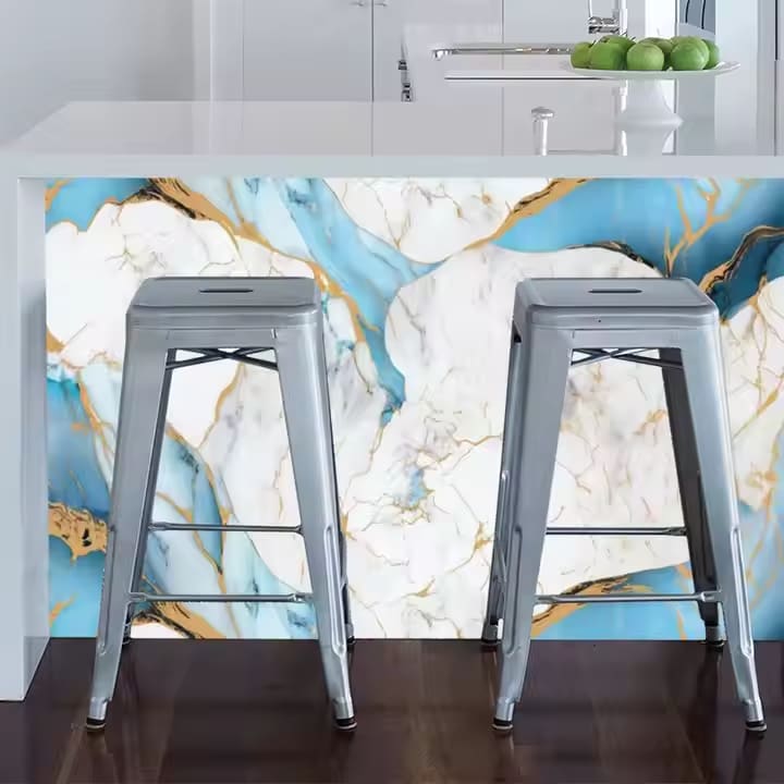 Adaugă un strop de rafinament și serenitate oricărui spațiu cu această folie autoadezivă pentru perete, care imită perfect marmura albastru pastel, cu accente fine de auriu. Cu dimensiuni de 0.6 x 3 m, această folie este ideală pentru a transforma rapid și elegant orice încăpere, aducând un aer calm și sofisticat.