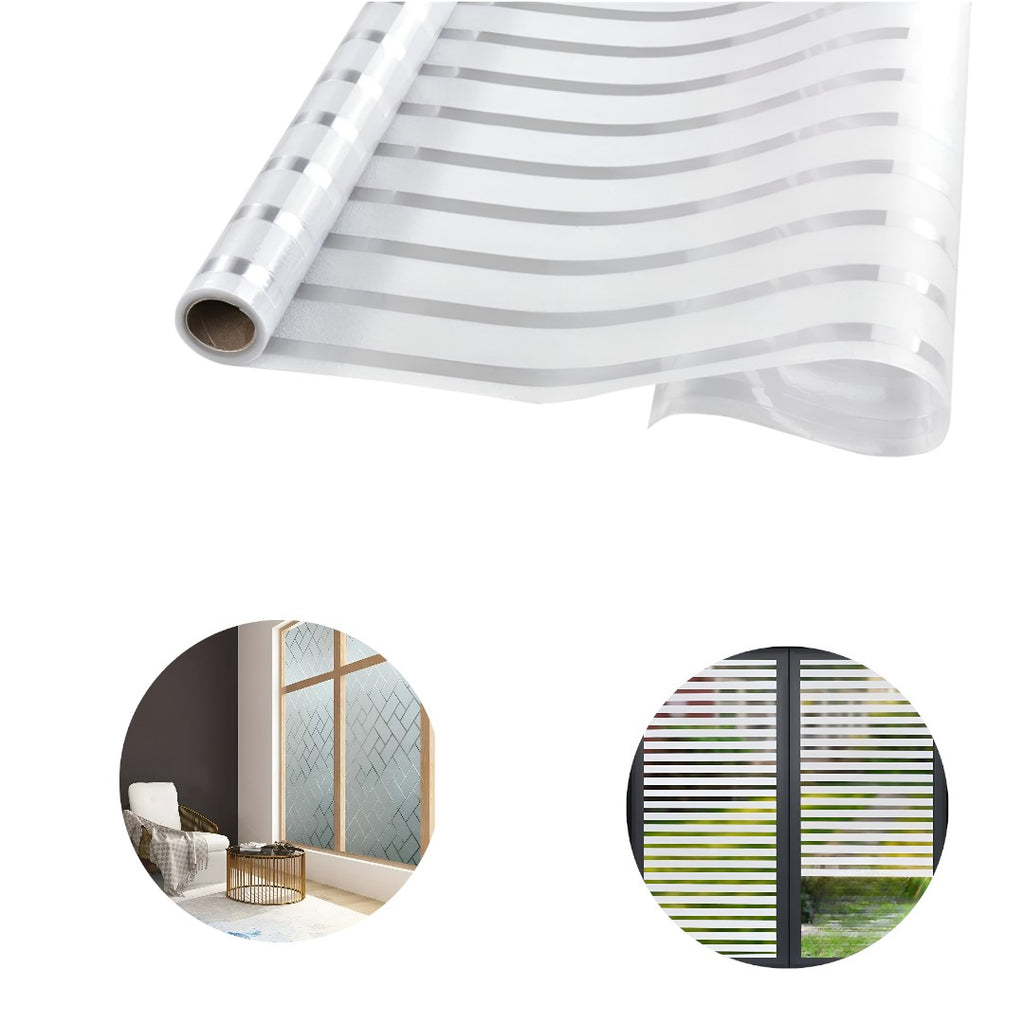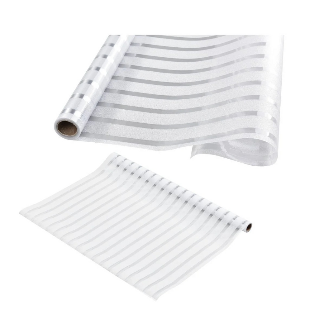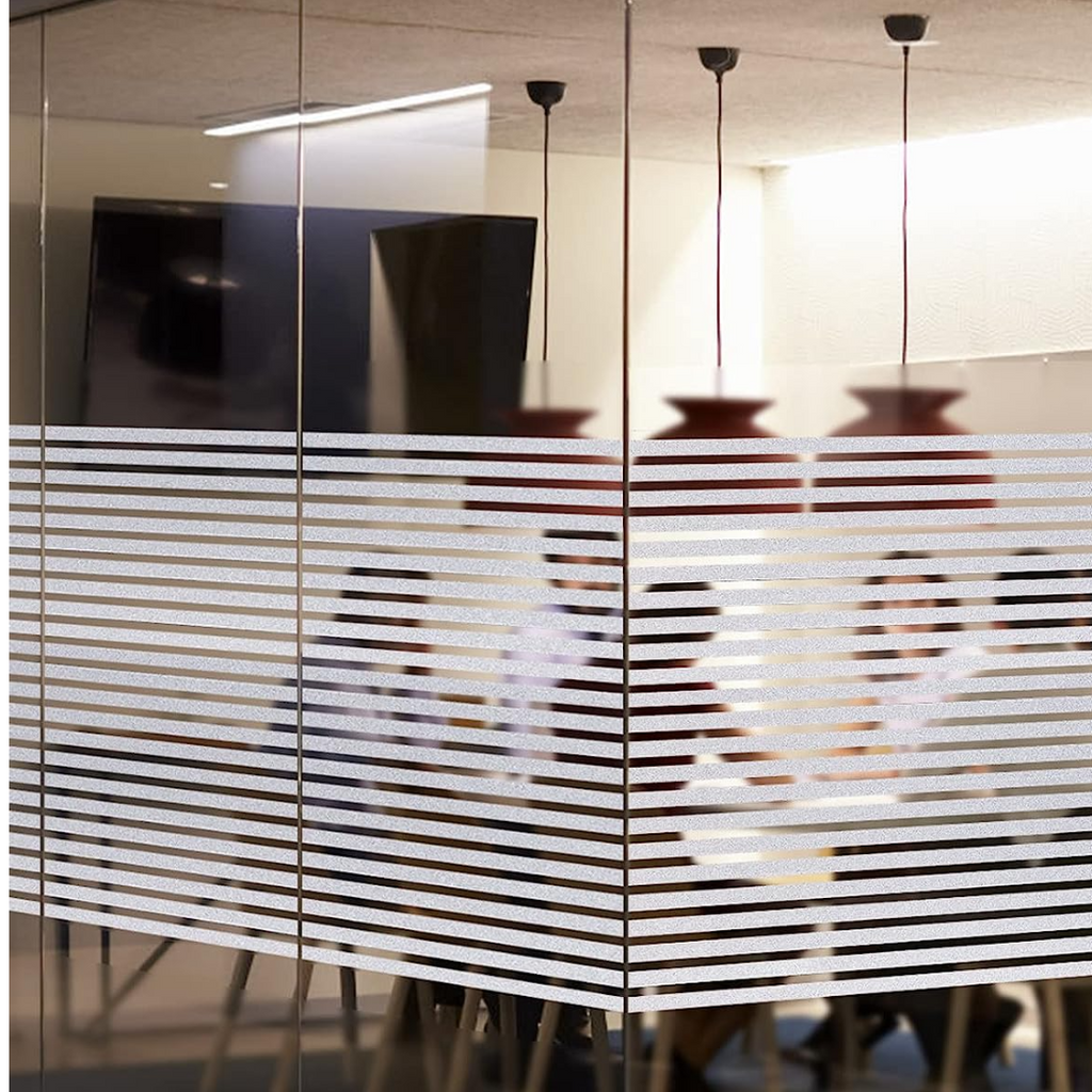 Folia de sablare cu dungi late albe este ideala pentru evidentierea partitiilor din sticla din cladirile de birouri. Este o folie de sablare din PET transparent cu imprimeu dungi alb. Distanta transparenta dintre dungi este de 1 cm. Dungile sunt verticale pe lungimea rolei.
