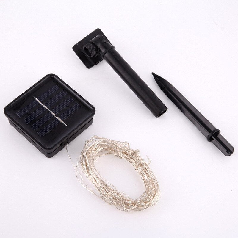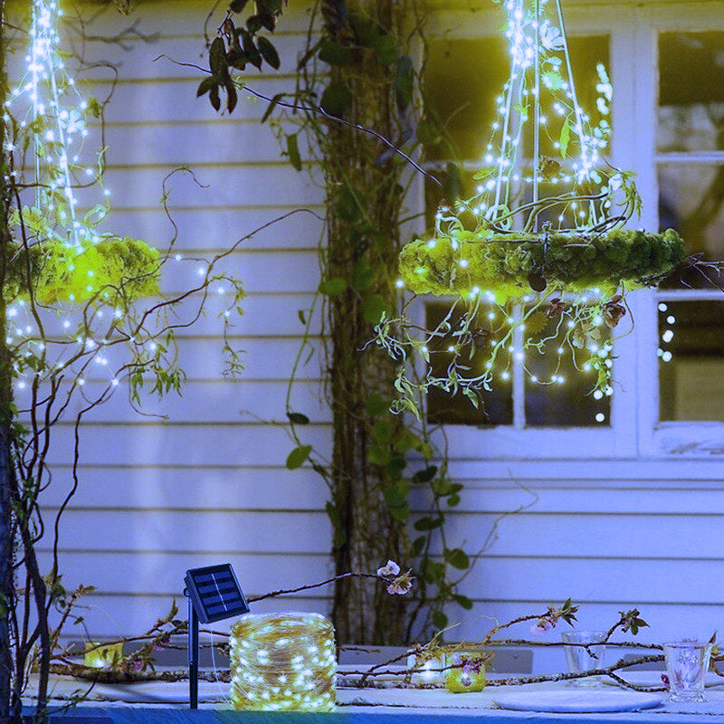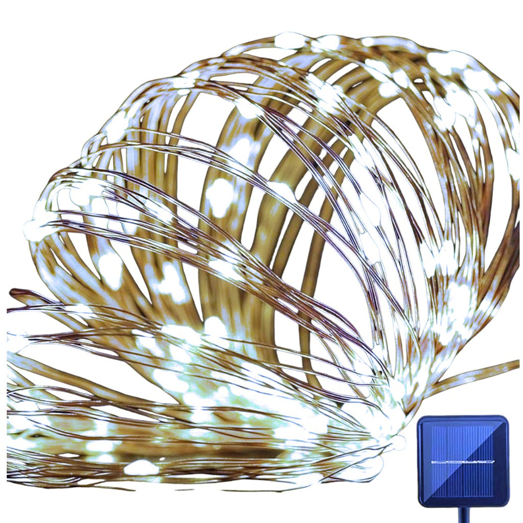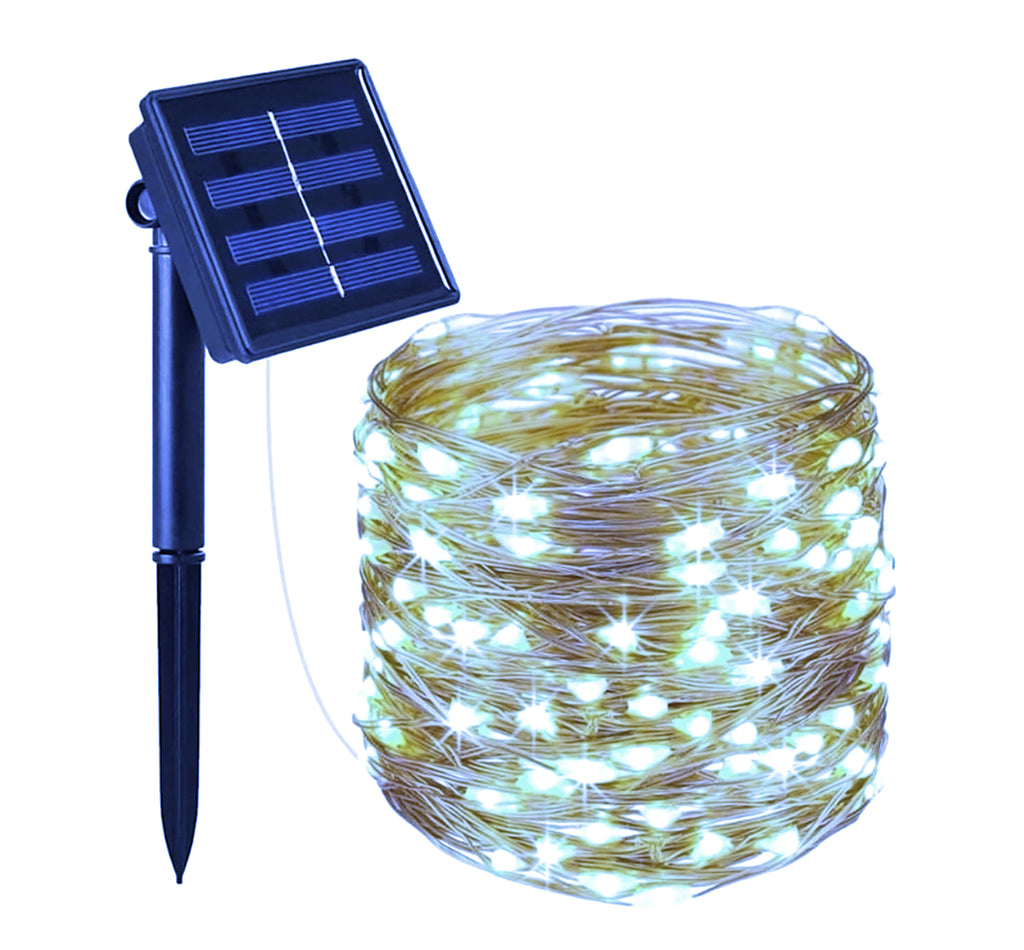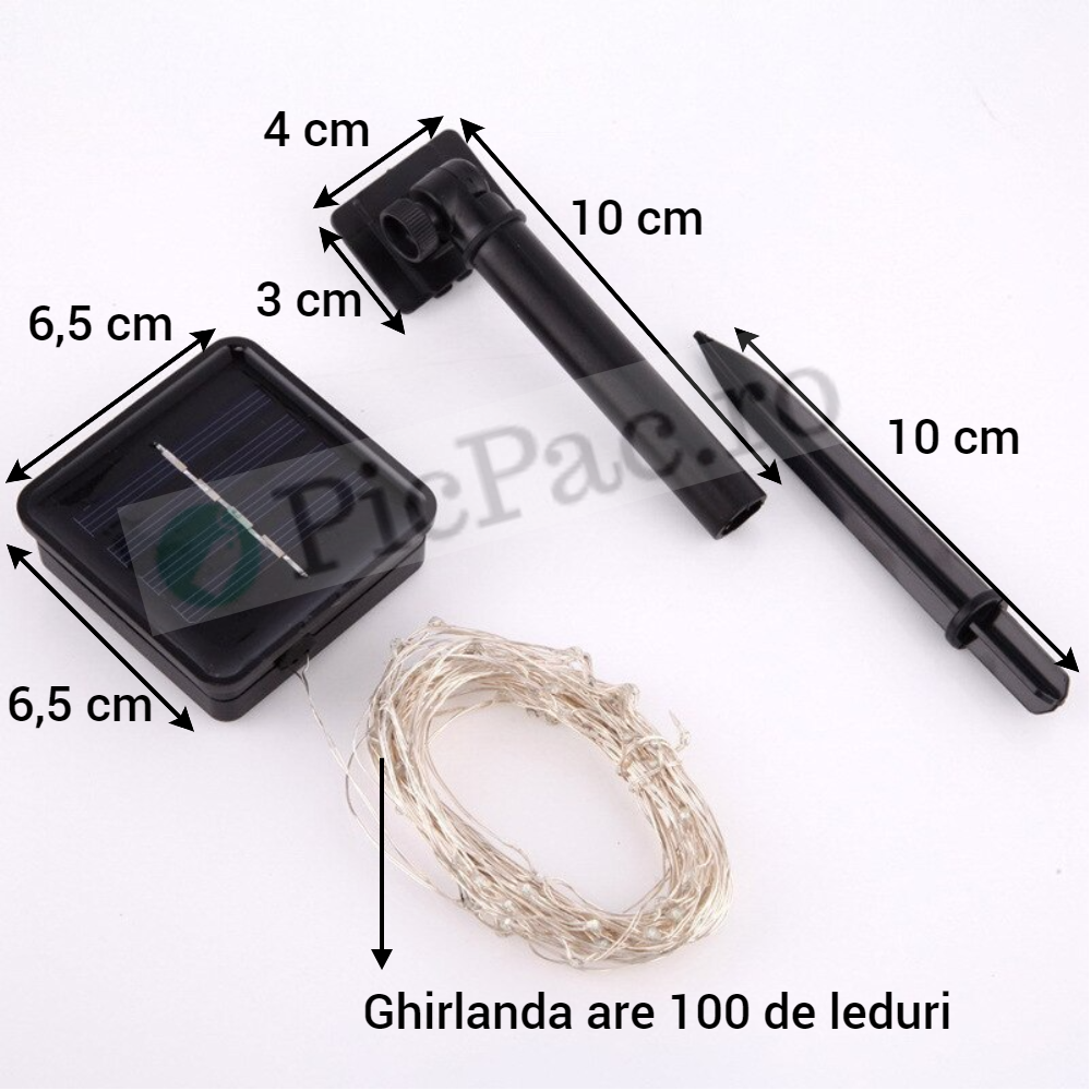E din cupru, cu 100 LED-uri, cu alimentare de la modulul solar inclus.