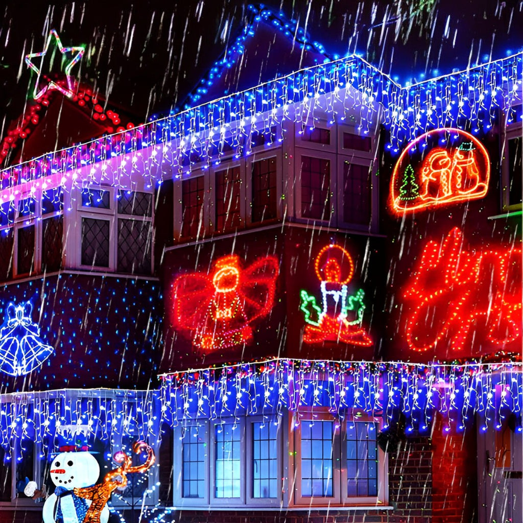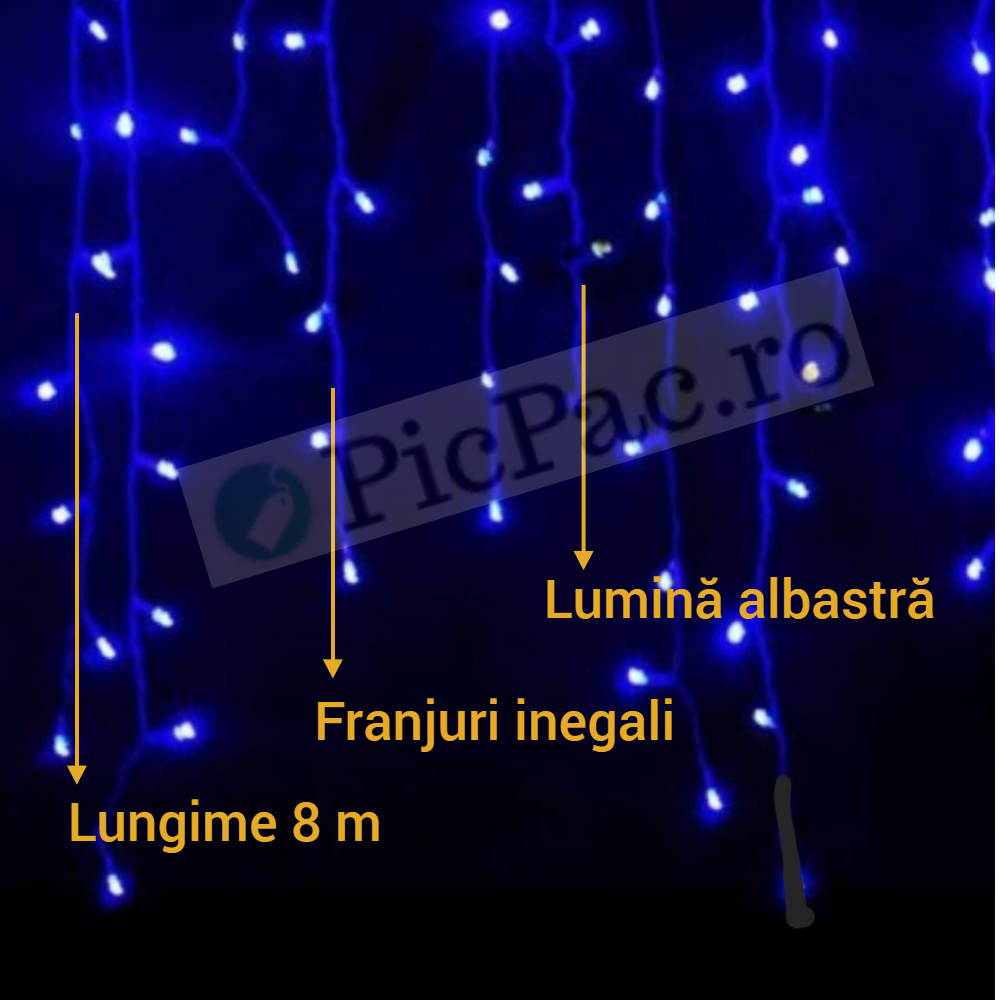 Instalatie cu 300 de led-uri pentru Craciun, foarte frumoasa, stil perdea de franjuri inegali cu led , lungime 12 m. Rezistenta la inghet, efect luminos deosebit, cu 8 jocuri diferite de lumini.