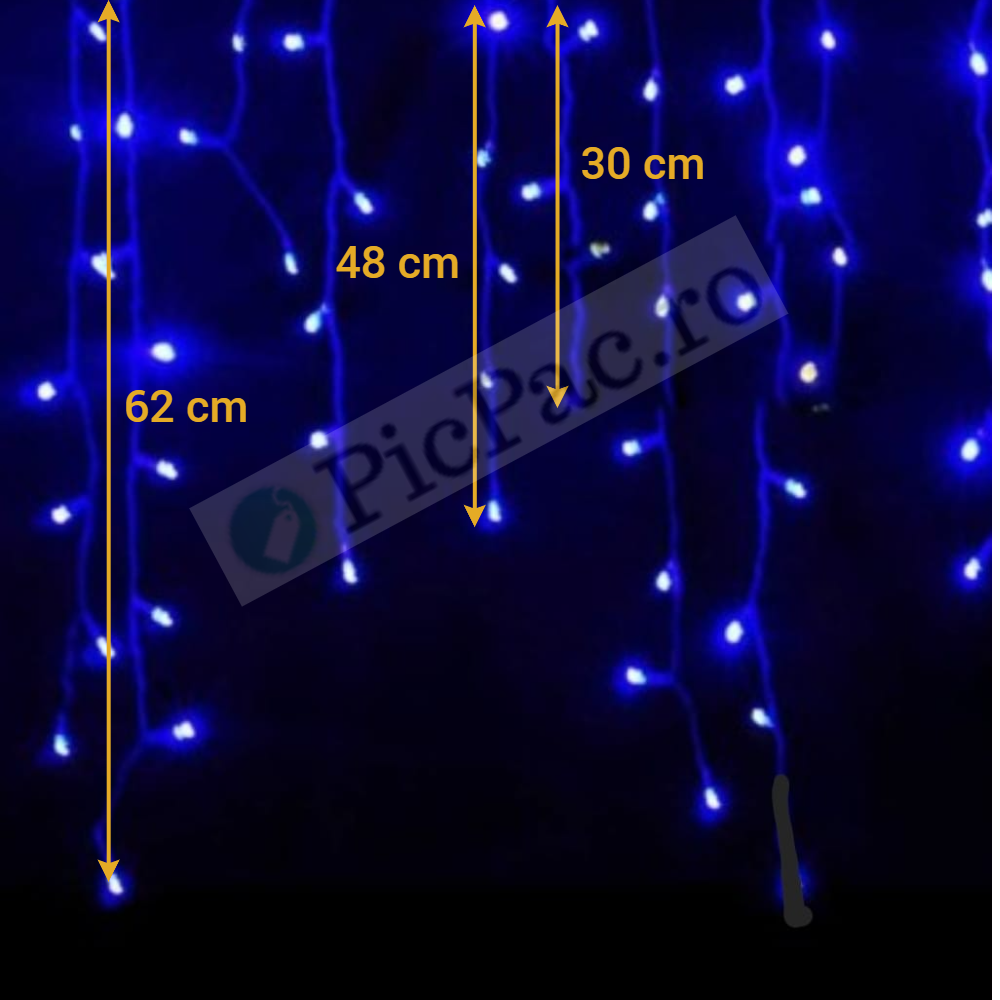Franjurii cu led-uri sunt impartiti astfel: 16 fire cu lungimea de 30 cm , apoi 16 franjuri cu lungimea de 48 cm, urmand alte 16 franjuri cu lungime de 62 cm.