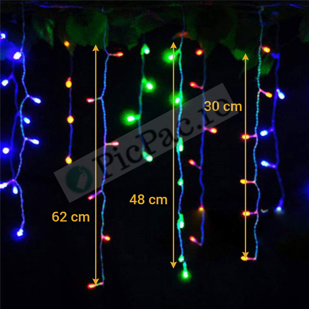 Franjurii cu led-uri sunt impartiti astfel: 16 fire cu lungimea de 30 cm , apoi 16 franjuri cu lungimea de 48 cm, urmand alte 16 franjuri cu lungime de 62 cm.
