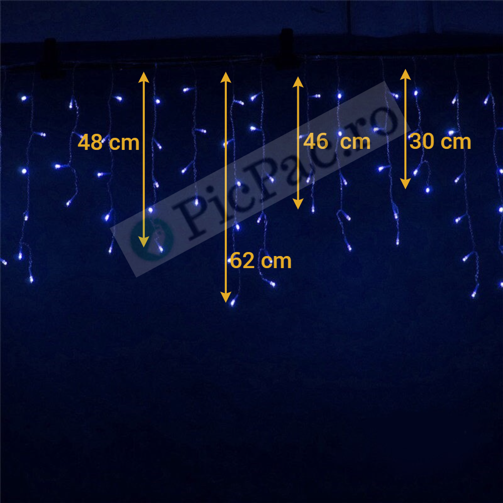 Contine 48 de franjuri inegali, cu lungimi de 62,48,46 si 30 cm. Din acest total, 16 franjuri cu lungimea de 30 cm au cate 4 led-uri asezate secvential, cele de 62 de cm au cate 8 led-uri apoi 16 franjuri cu lungimea de 48 cm au cate 6 led-uri,cele de 46 de cm au cate 6 led-uri.