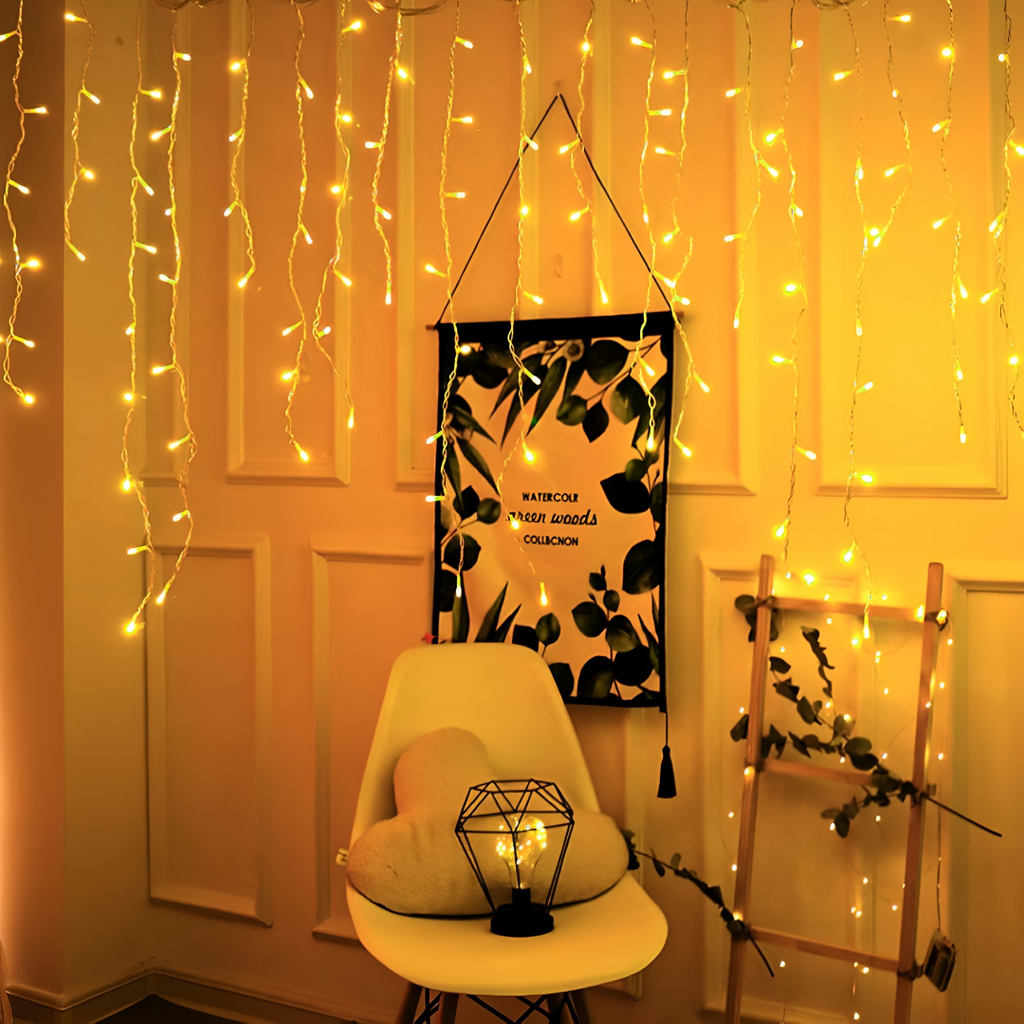Efect spectaculos: Cele 200 de LED-uri albe calde, dispuse în franjuri inegali, creează o atmosferă feerică și primitoare.