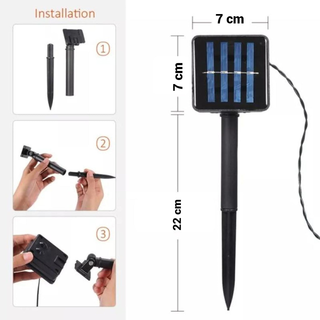 Alimentare Solara: Modulul solar se fixeaza pe sol folosind tarusul, iar lumina solara asigura energia necesara. Un comutator este folosit pentru a seta ghirlanda luminoasa pe diverse jocuri de lumini.