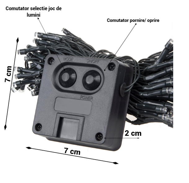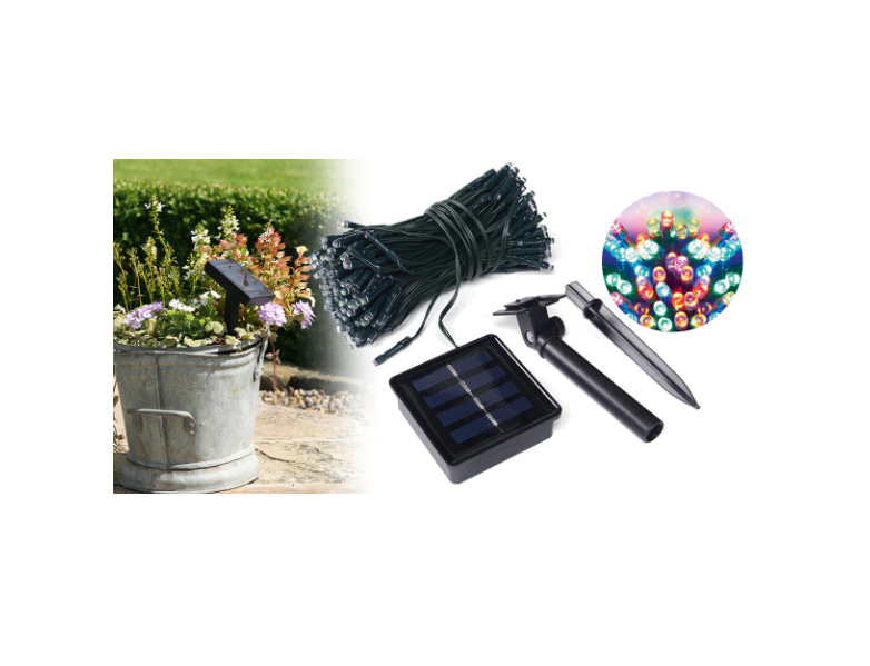 Alimentare Solara: Modulul solar se fixeaza pe sol folosind tarusul, iar lumina solara asigura energia necesara. Un comutator este folosit pentru a seta ghirlanda luminoasa pe diverse jocuri de lumini.