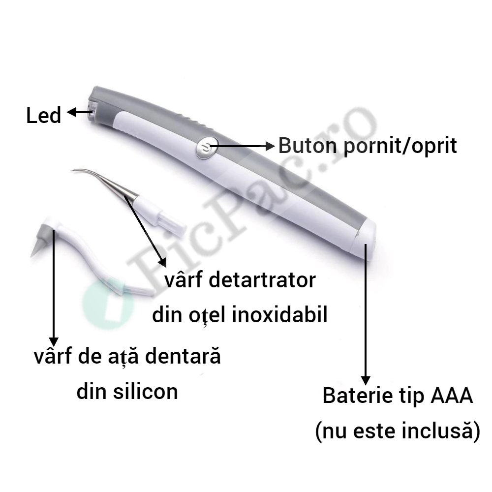 Dispozitivul pentru curatare dentara functioneaza cu o baterie tip AAA ( nu este inclusa)
