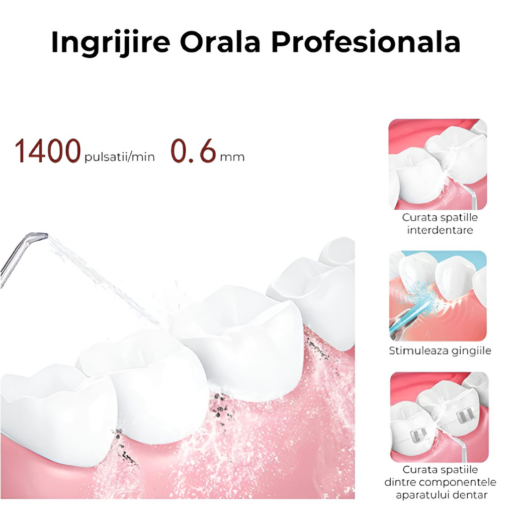 Curatarea spatiilor dintre dinti este foarte importanta pentru sanatatea orala in general. Utilizarea irigatorului bucal reprezinta o modalitate usoara de a curata in profunzime spatiul interdentar, indepartand placa bacteriana acolo unde periajul clasic si ata dentara nu o pot face.