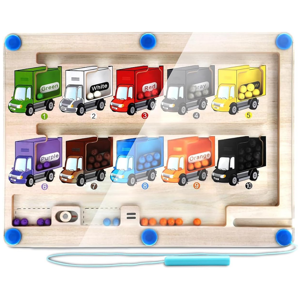 Numărătoare și potrivire magnetică: o jucărie de numărare pentru copiii de 3-5 ani. Numerele de la 1 la 10 sunt imprimate pe mașini, iar copiii folosesc un pix magnetic pentru a muta mărgelele de pe șină în cărucioare. Puzzle-ul magnetic permite exersarea abilităților de coordonare a culorilor, numărare și algoritm, stimulând în același timp răbdarea și concentrarea.