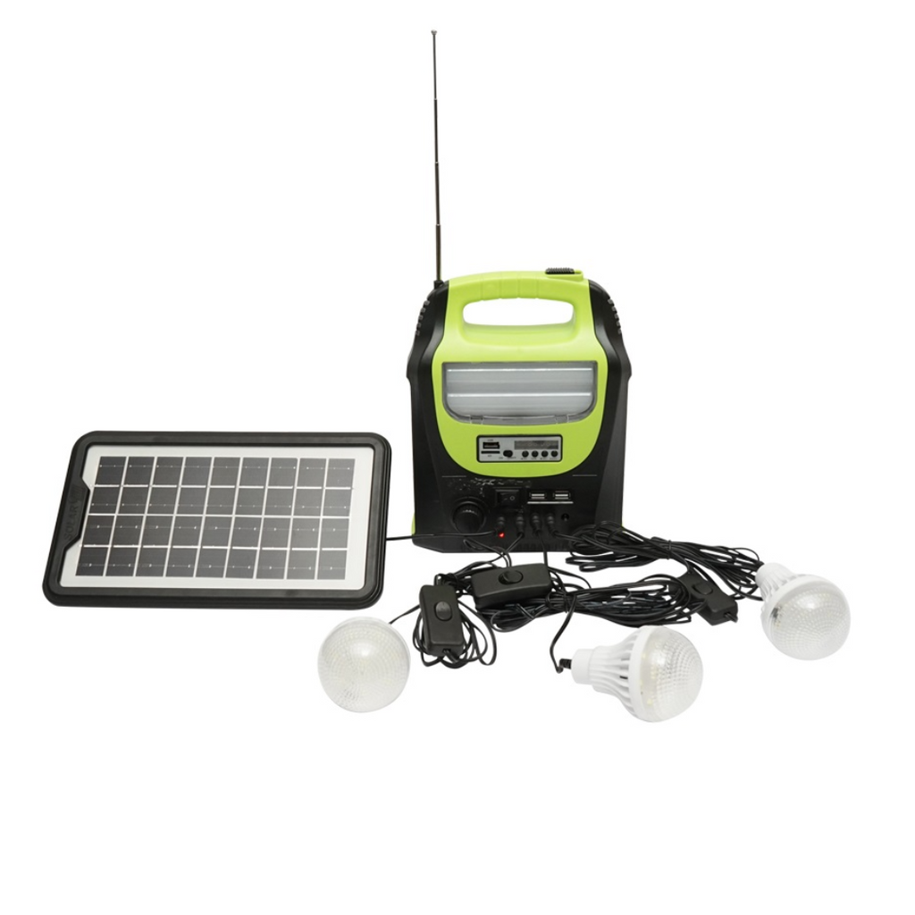 Kit-ul solar vă oferă toate funcționalitățile necesare: iluminat portabil cu cele 3 becuri LED SMD, lumina de ajutor a lanternei LED și posibilitatea încărcării dispozitivelor mobile de la acumulatorul inclus în sistem. Becurile sunt alimentate direct de la bateria sistemului și pot fi utilizate pentru a oferi lumina de veghe.