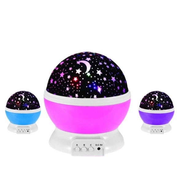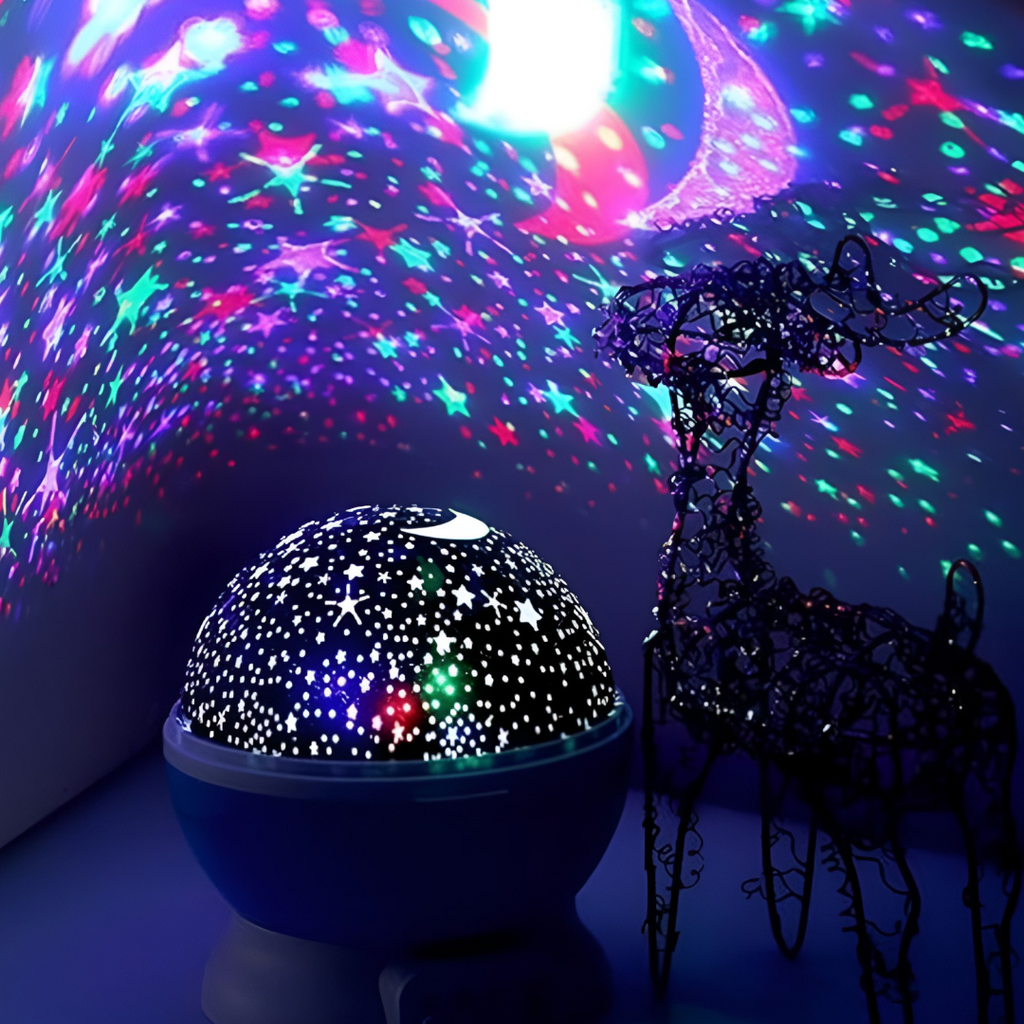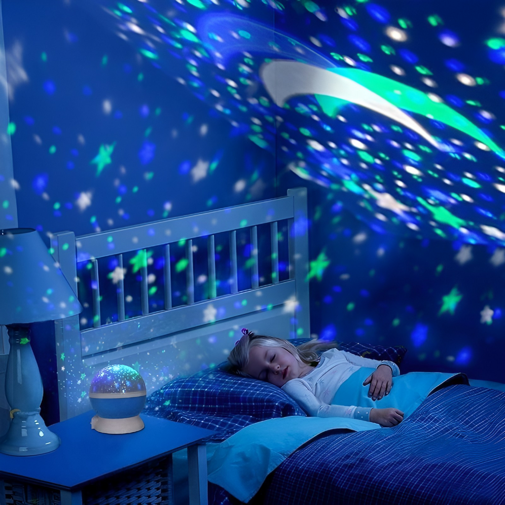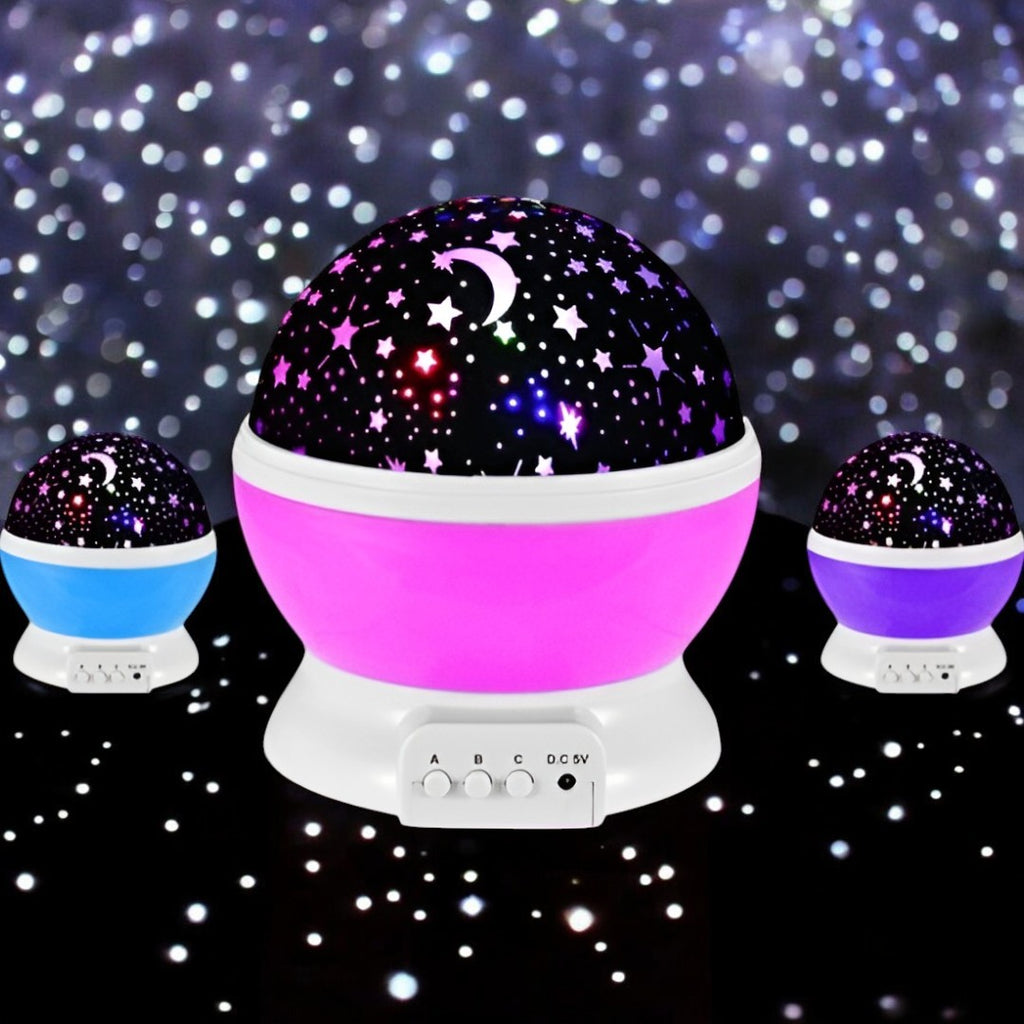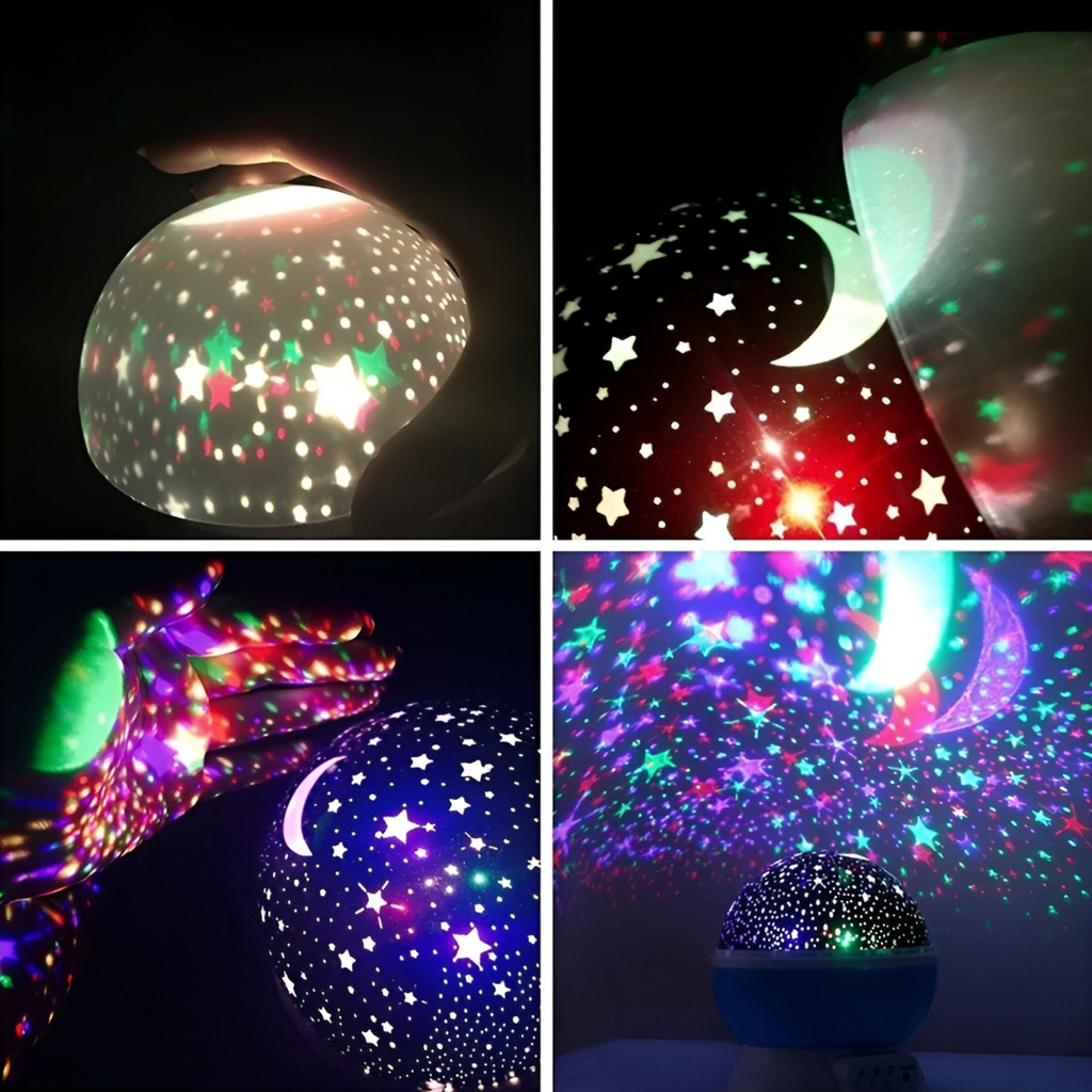 - Din interiorul globului, lampa proiecteaza constelatii magice de stele pe tavanul si peretii dormitorului copilului, in 4 optiuni de culoare magica linistitoare: galben, albastru, verde si rosu, existand posibilitatea de a selecta cate o culoare diferita in fiecare noapte in functie de preferinte.