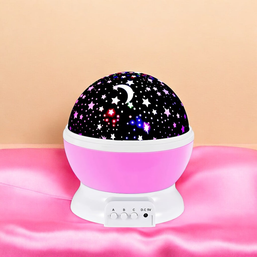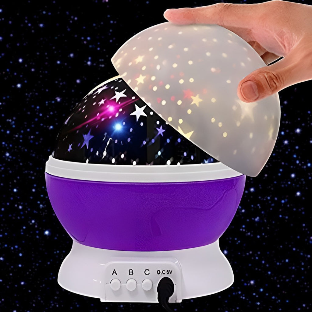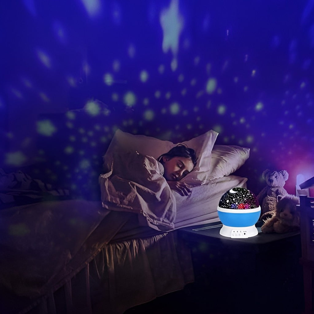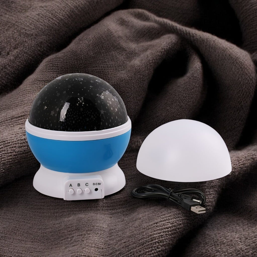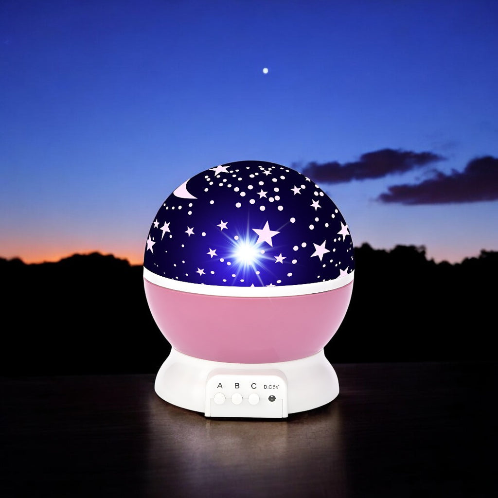 - Din interiorul globului, lampa proiecteaza constelatii magice de stele pe tavanul si peretii dormitorului copilului, in 4 optiuni de culoare magica linistitoare: galben, albastru, verde si rosu, existand posibilitatea de a selecta cate o culoare diferita in fiecare noapte in functie de preferinte.
