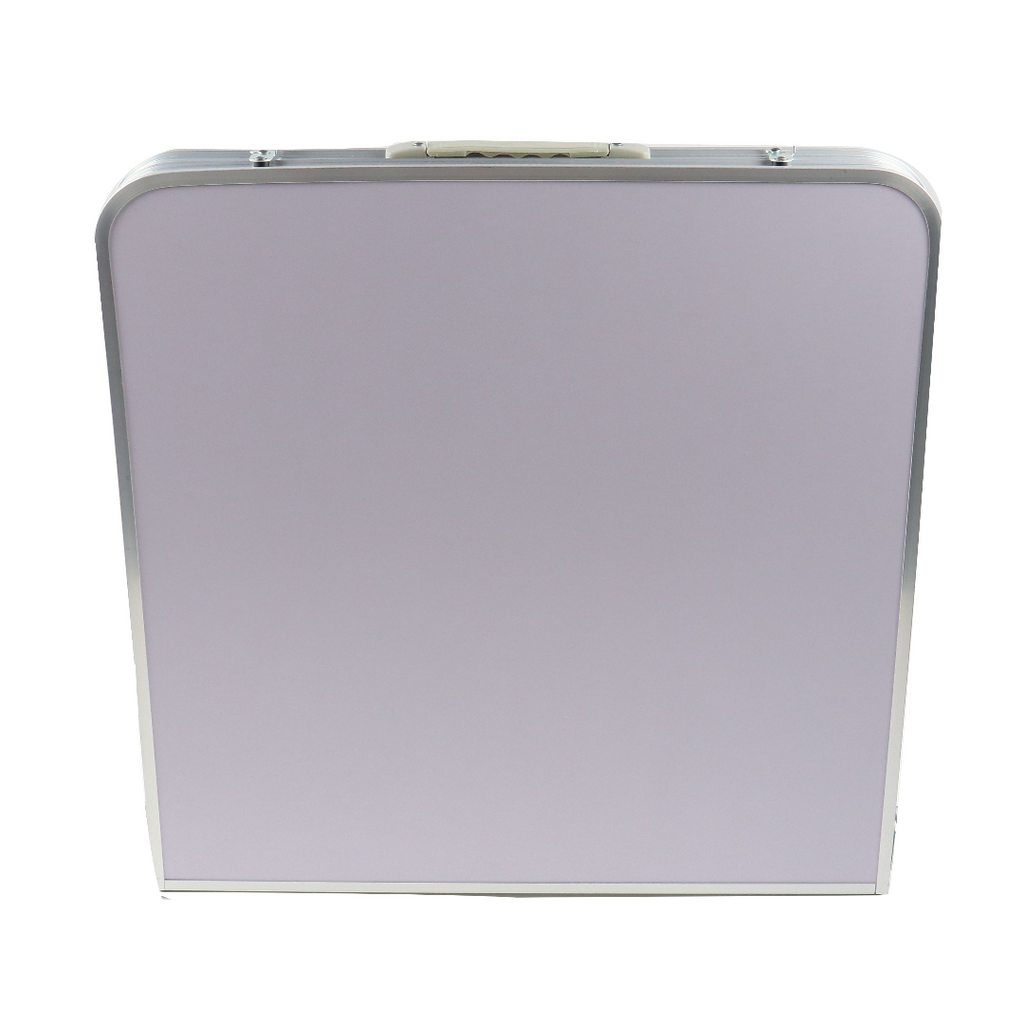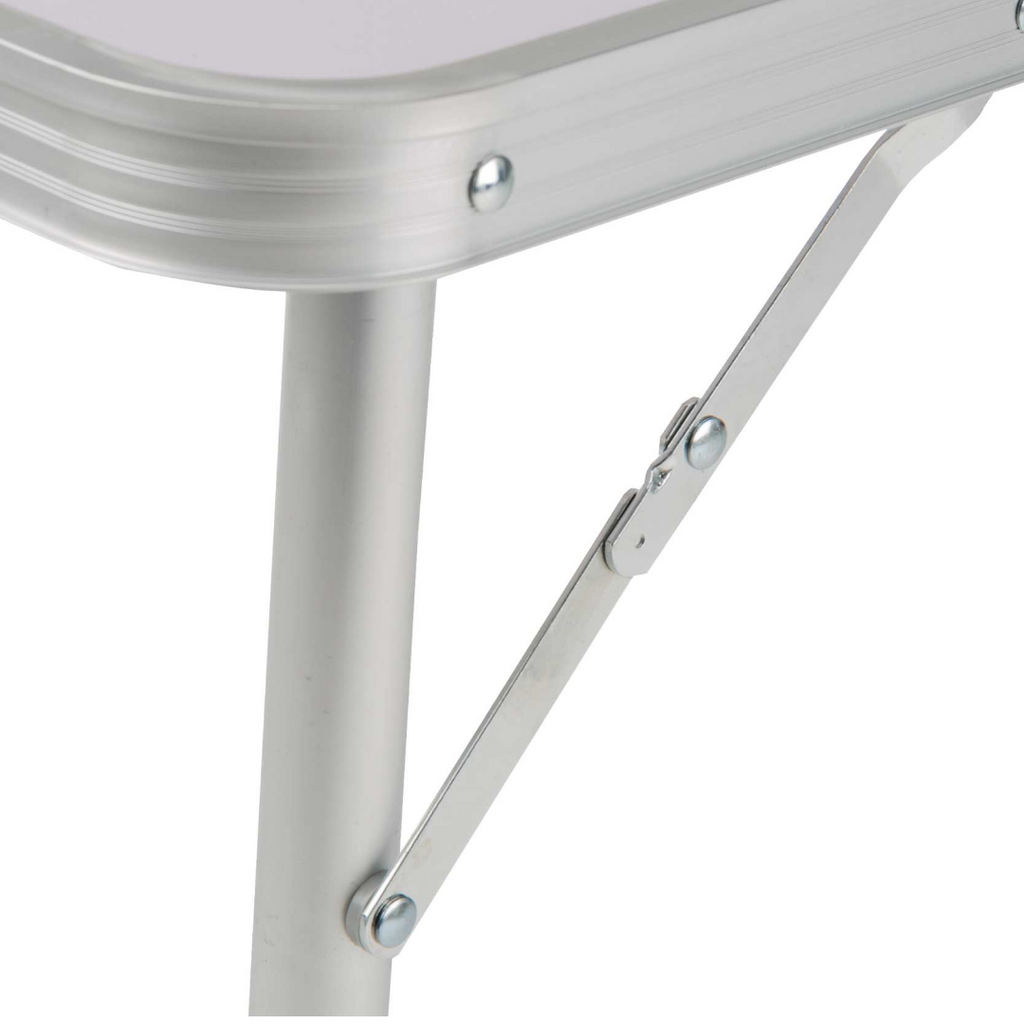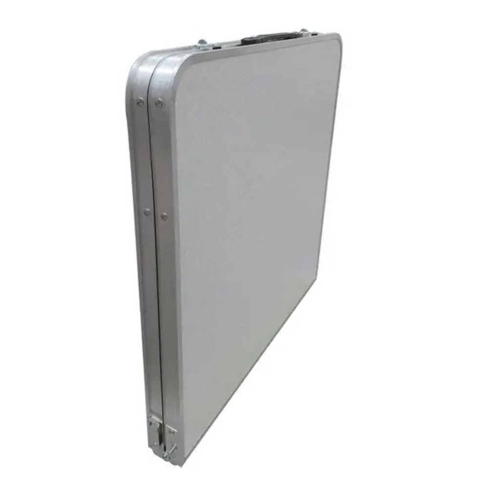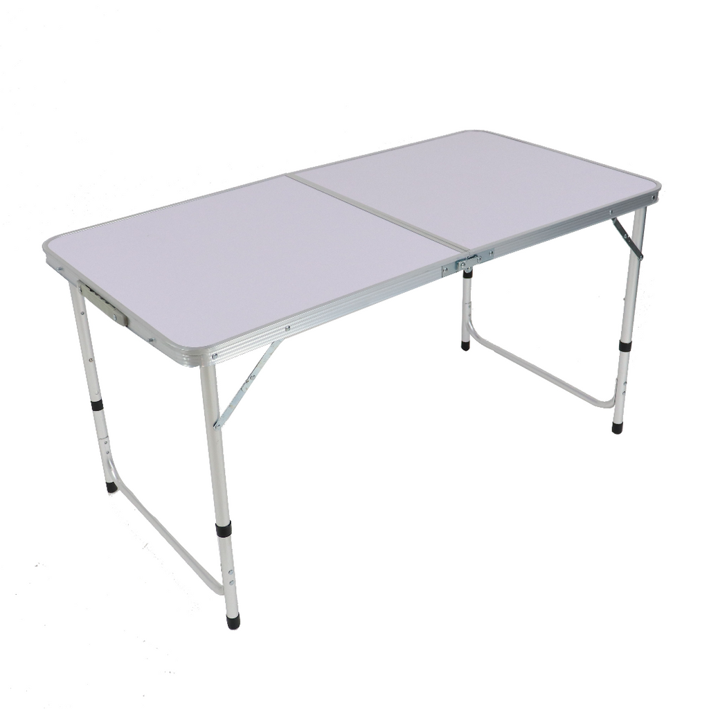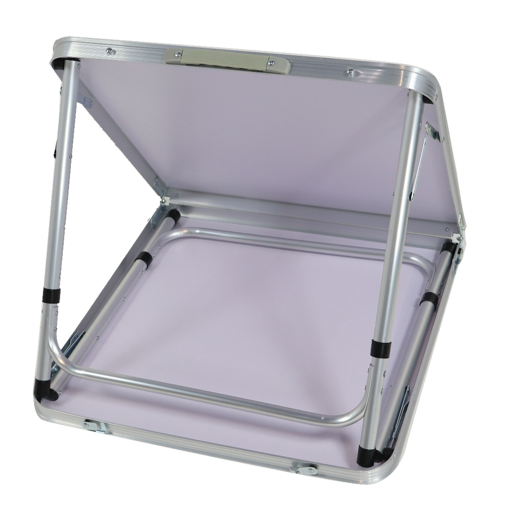 Masa pentru camping are scheletul fabricat din aluminiu tratat prin anodizare, rezultand astfel o suprafata lucioasa, fara a mai fi necesara aplicarea unui strat de vopsea. Blatul este confectionat din MDF.