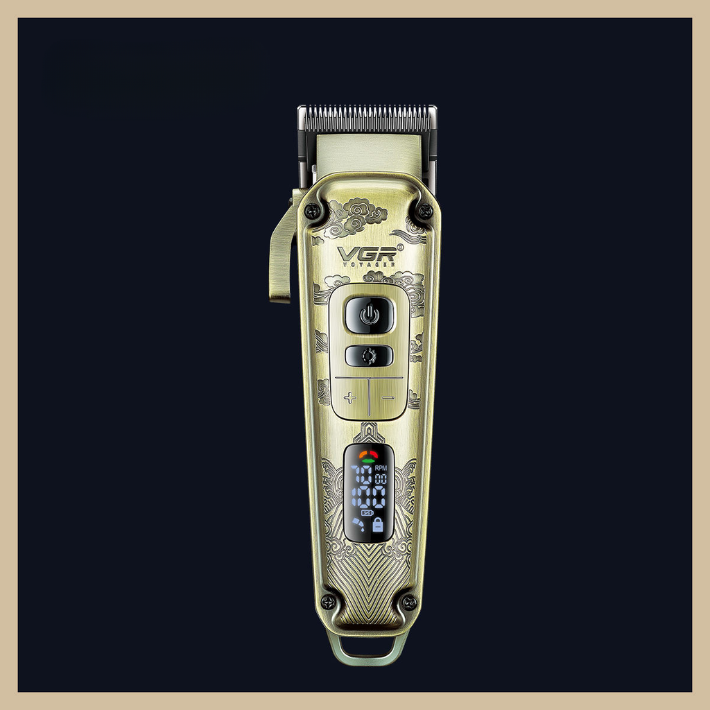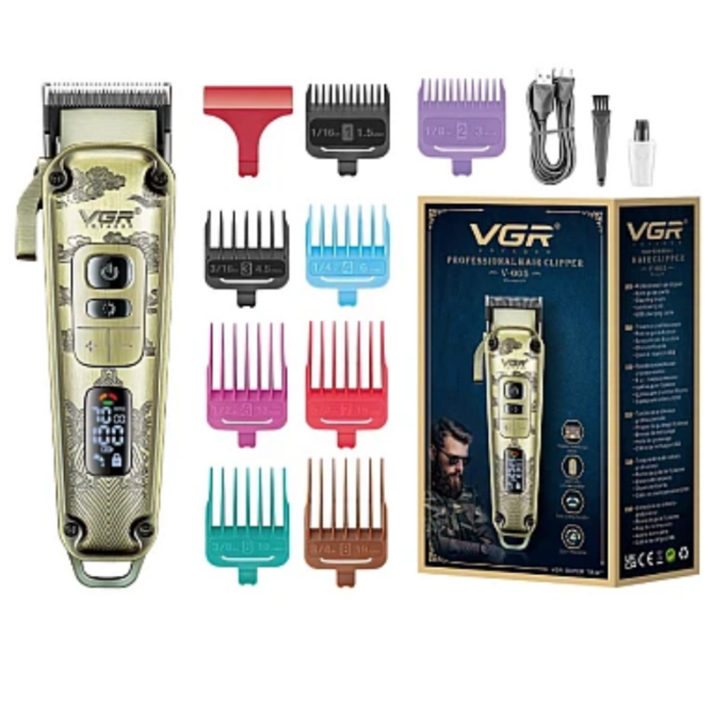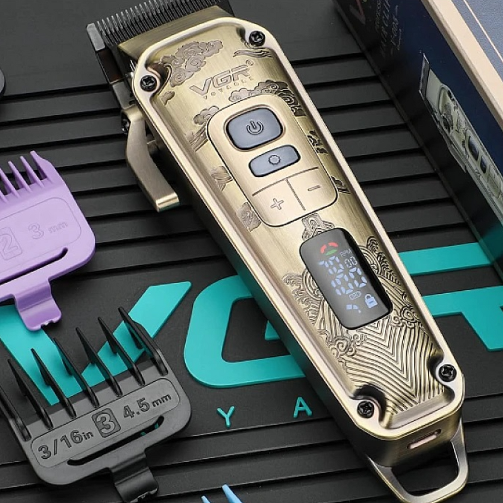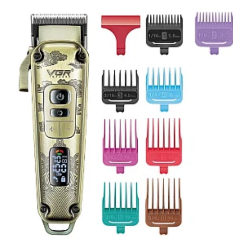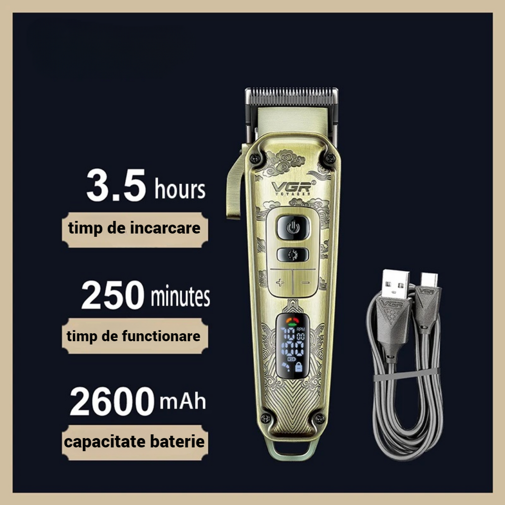 Masina de tuns profesionala, carcasa metalica premium, 8 distantiere si accesorii incluse, afisaj LED VGR V-005 redefinește standardele de excelență în tuns cu o combinație impresionantă de design robust și tehnologie de ultimă generație.