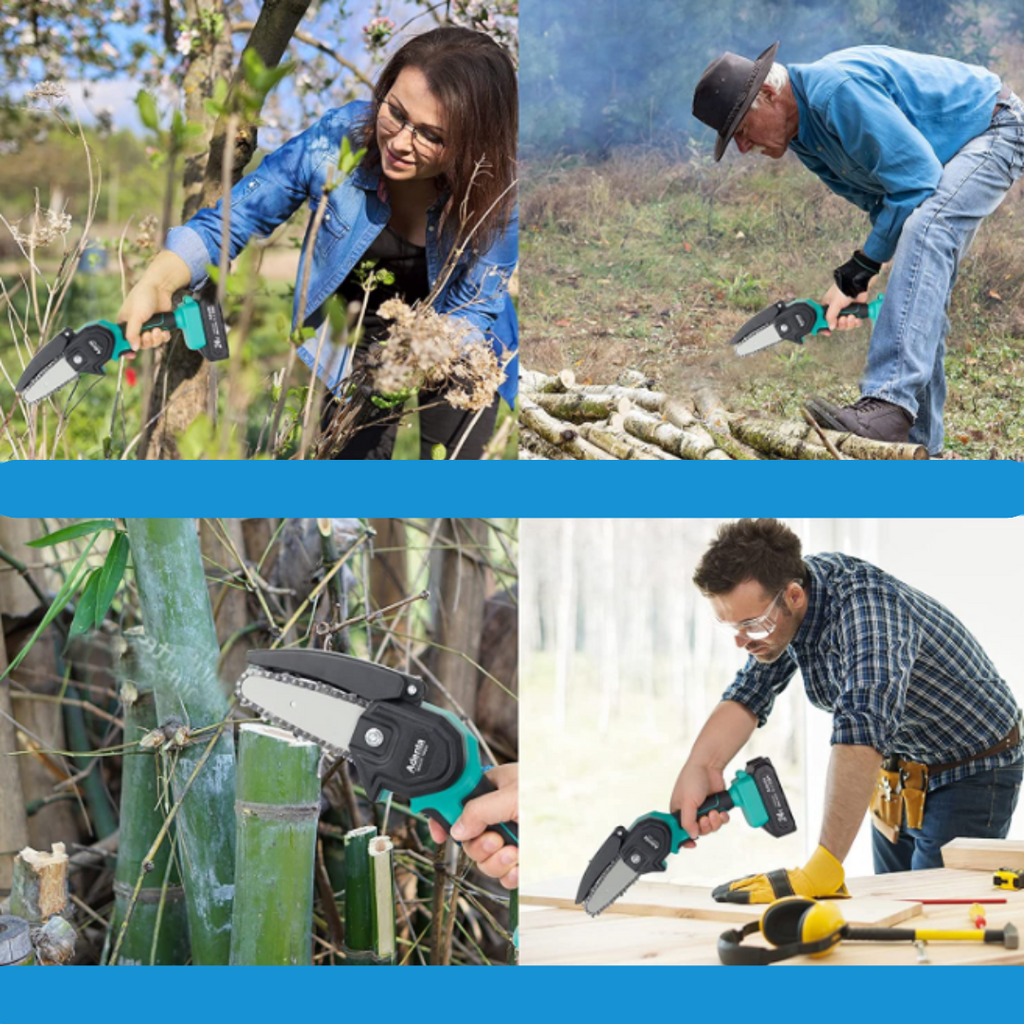 O mini drujbă cu 2 lanturi, fără fir, lama de 6 inch și portabilă poate fi un instrument util pentru tăierea lemnului sau a altor materiale.