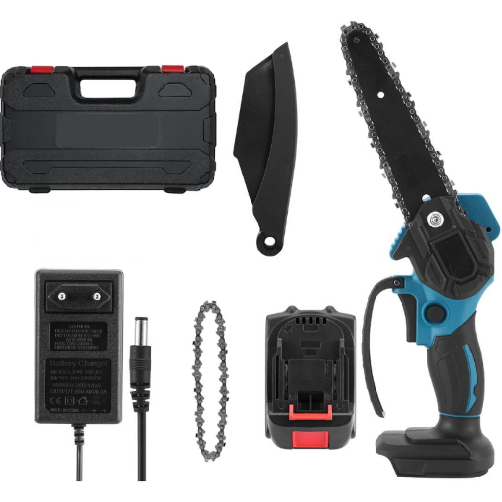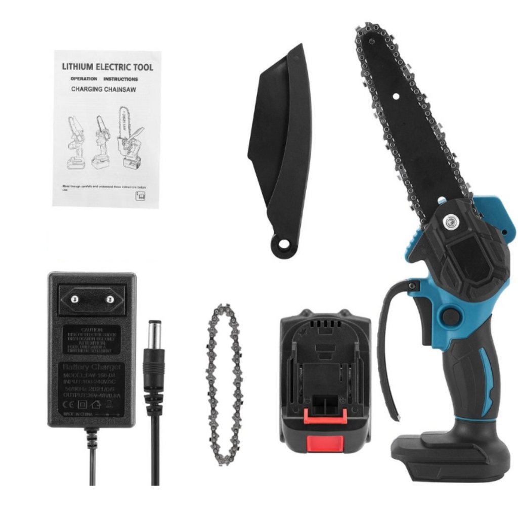 O mini drujbă electrică portabilă de 6 inch și 24V poate fi un instrument util pentru tăierea lemnului sau a altor materiale.