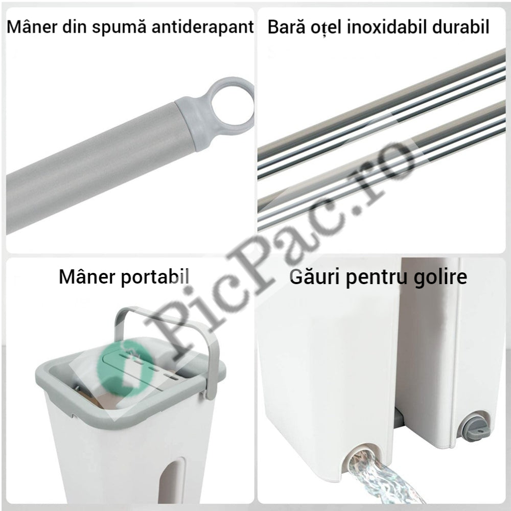 - Mopul curata repede si eficient si functioneaza precum un magnet care atrage murdaria, este extrem de absorbant, dar in acelasi timp, delicat cu suprafetele tale si are un maner de aluminiu ce se poate ajusta.