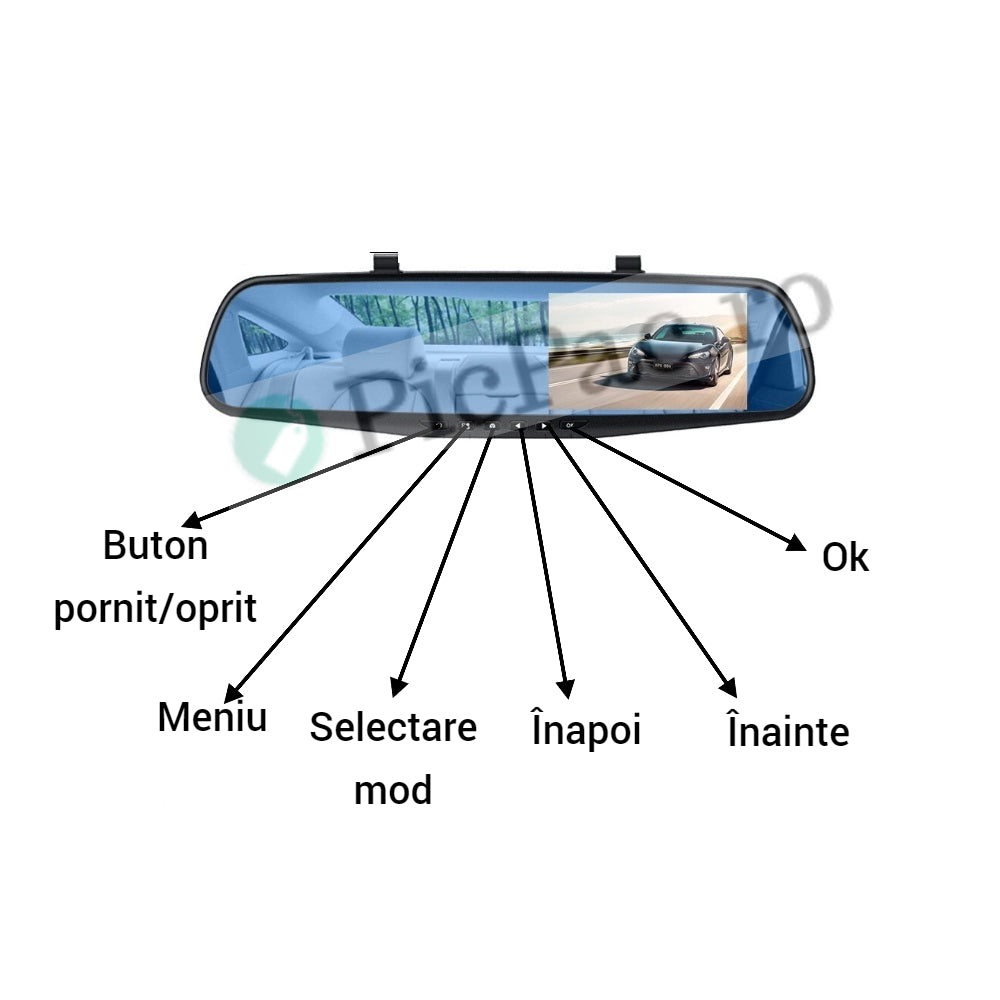 Port mini USB Dimensiune: Lungime oglinda: 30 cm Latime oglinda: 8 cm Lungime cablu incarcare: 2,8 m Oglinda cu camera se fixeaza de oglinda masinii prin 2 bride tip scara de cauciuc.