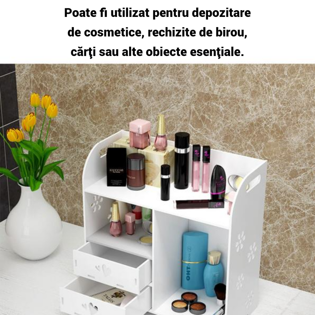 Realizat din materiale rezistente și ușor de întreținut, acest suport este ideal pentru birou, baie, dormitor sau orice alt spațiu în care ai nevoie de organizare eficientă. Designul său elegant, combinat cu funcționalitatea oferită de sertarele și compartimentele multiple, îl face un accesoriu esențial pentru orice locuință.