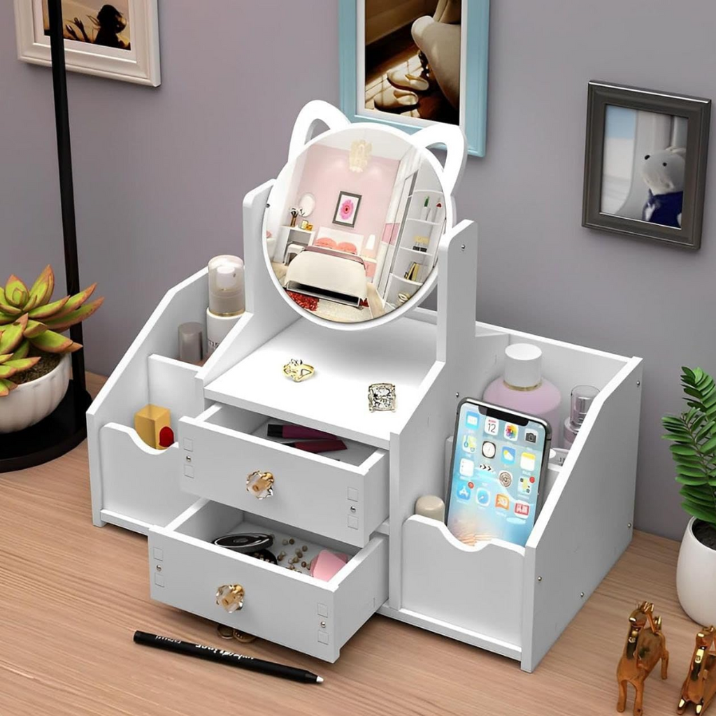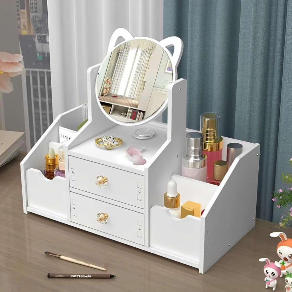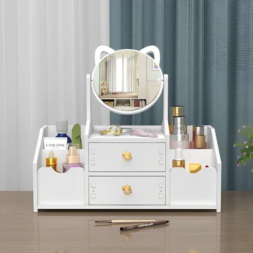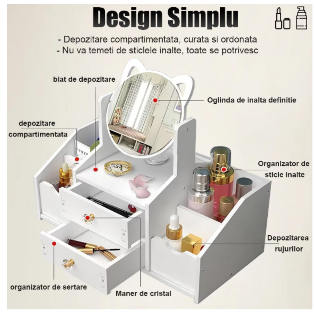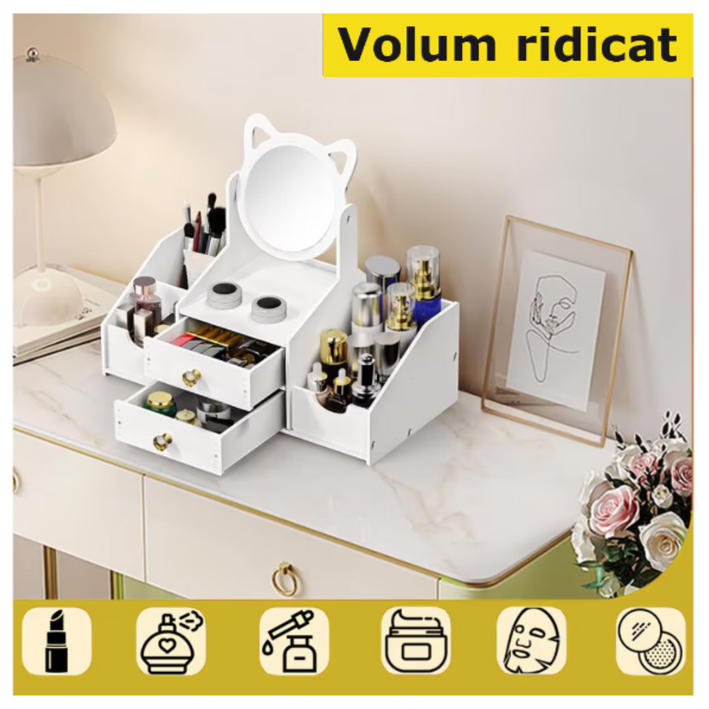 Acest organizator este echipat si cu o oglinda decorativa in forma de pisica, adaugand un element jucaus si stilat spatiului tau de machiaj. Realizat din PVC de calitate, organizatorul este durabil si usor de intretinut, perfect pentru a-ti pastra toate obiectele organizate intr-un singur loc.