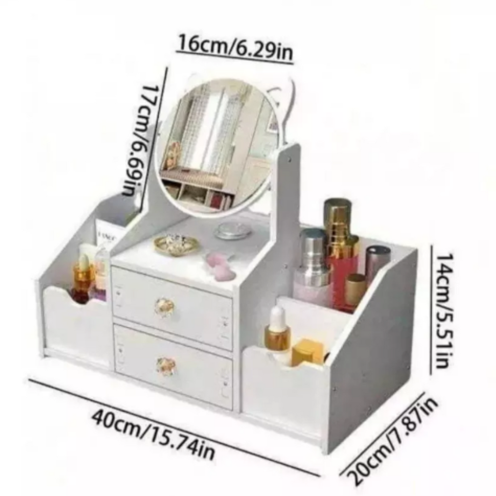 Organizatorul pentru cosmetice si bijuterii este solutia perfecta pentru a-ti pastra toate produsele de make-up si accesoriile ordonate si la indemana. Cu un design elegant si modern, acest suport dispune de 4 compartimente spatioase si 2 sertare, oferind suficient spatiu pentru a organiza fardurile, rujurile, pensulele si bijuteriile tale preferate.